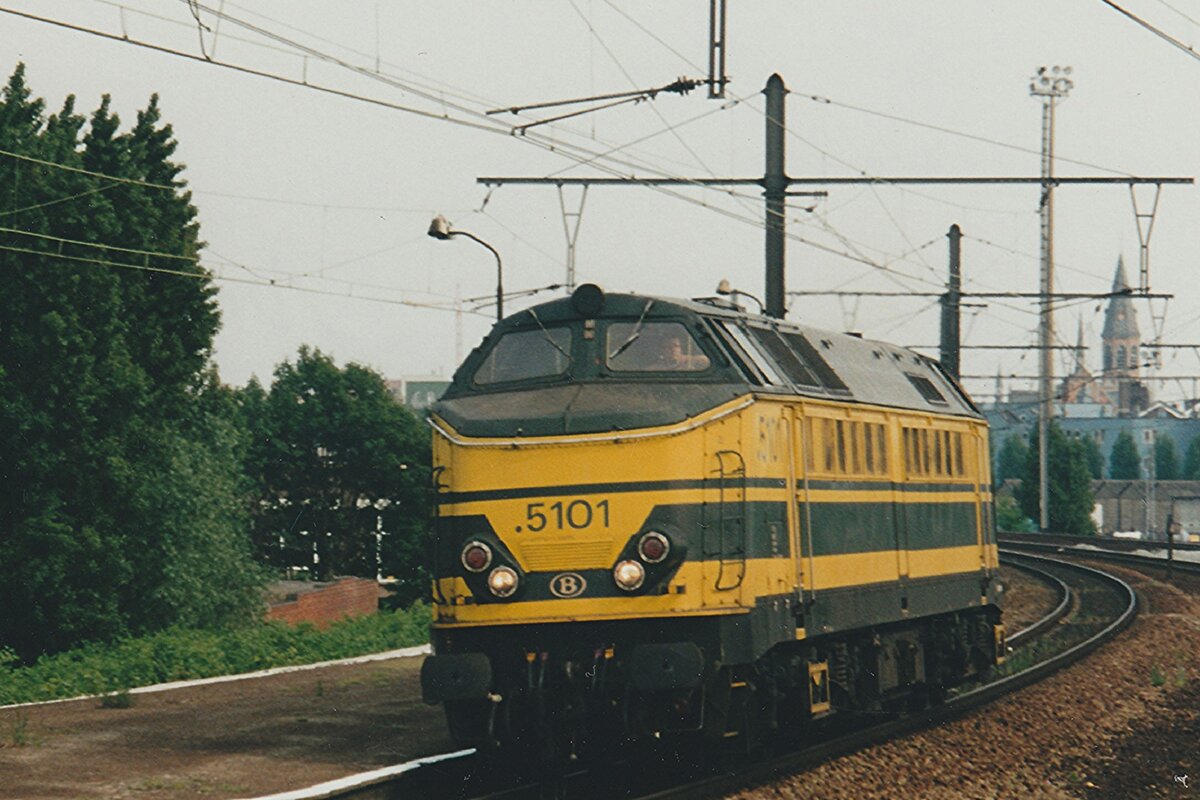 Am 17 September 2004 durchfahrt NMBS 5101 solo Antwerpen-Dam. Lokreihe und Bahnhof sind leider längst Geschichte.
