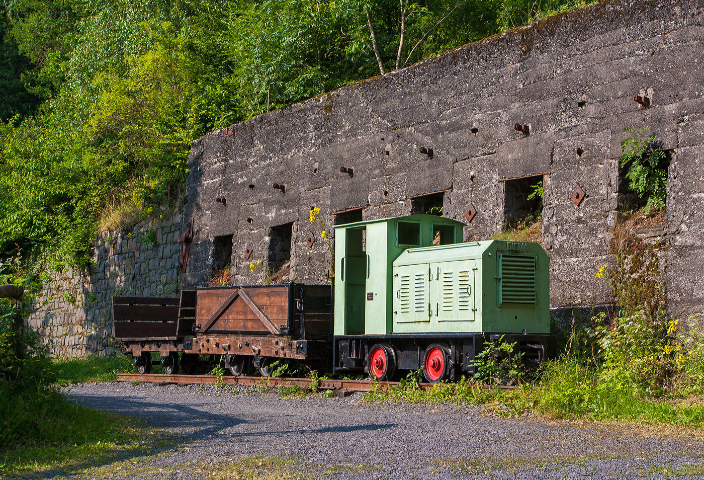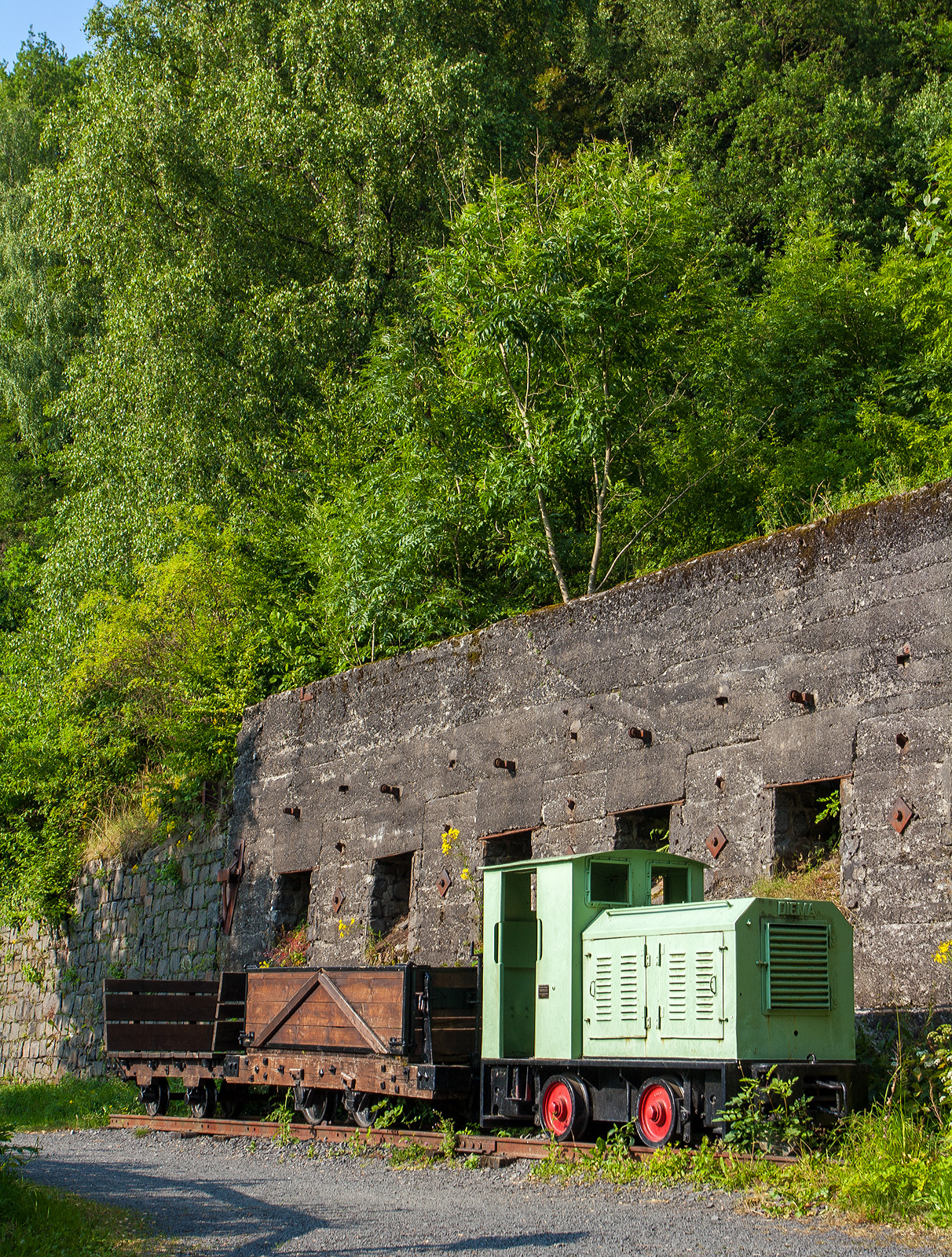 Die DIEMA Feldbahnlok vom Typ DL 6, Fabriknummer 1983, Baujahr 1956, Leistung 18 KW, Gewicht 1.115 kg, von 700 auf 600 mm um gespurt, als Denkmallok am 28.10.2021 mit zwei Grubenwagen beim Wodanstolln in Neunkirchen-Salchendorf. Wobei eigentlich ganz stilecht bzw. geschichtlich richtig ist dieses Denkmal nicht, denn die Lok ist eine Feldbahnlok. Bei den Siegerländer Erzgruben kamen aber Gubenloks zum Einsatz.