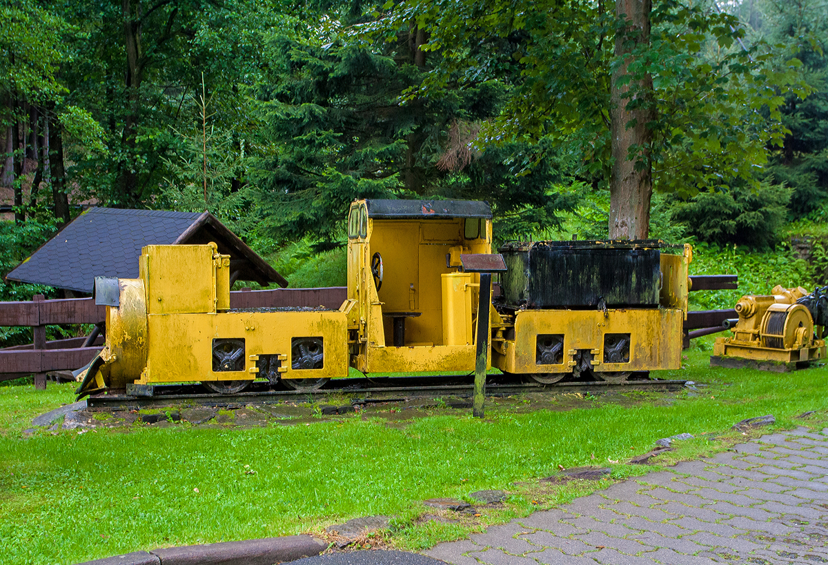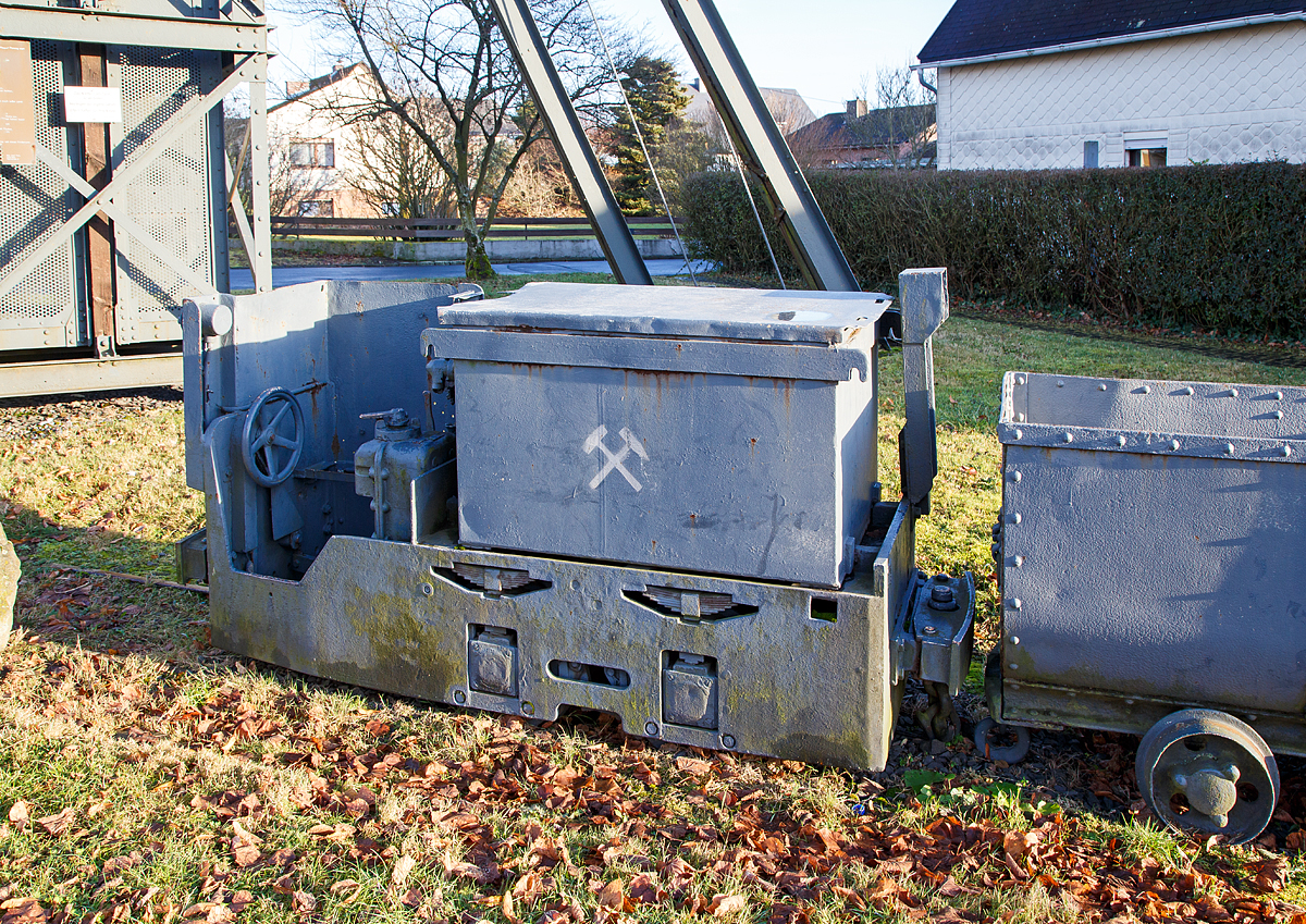 Die Meterspur-SiG-Akkulokomotive vom Typ B12LX-Ensdorf, aus dem DSK Saarbergbau, als Denkmallok vor dem Eingang, hier am 01.05.2015.