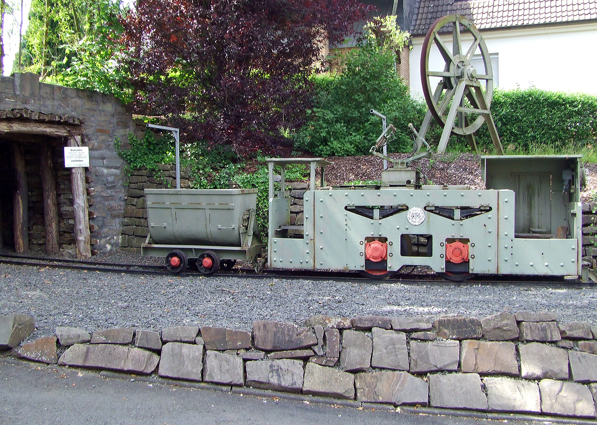 Vor dem Eingang zum Feld- und Grubenbahnmuseum Fortuna, Solms-Oberbiel (FGF) ist (am 07.07.2013) ist die AEG Gruben-Fahrdrahtlokomotive EL 5 (FGF Lok 62) mit einer Lore ausgestellt.