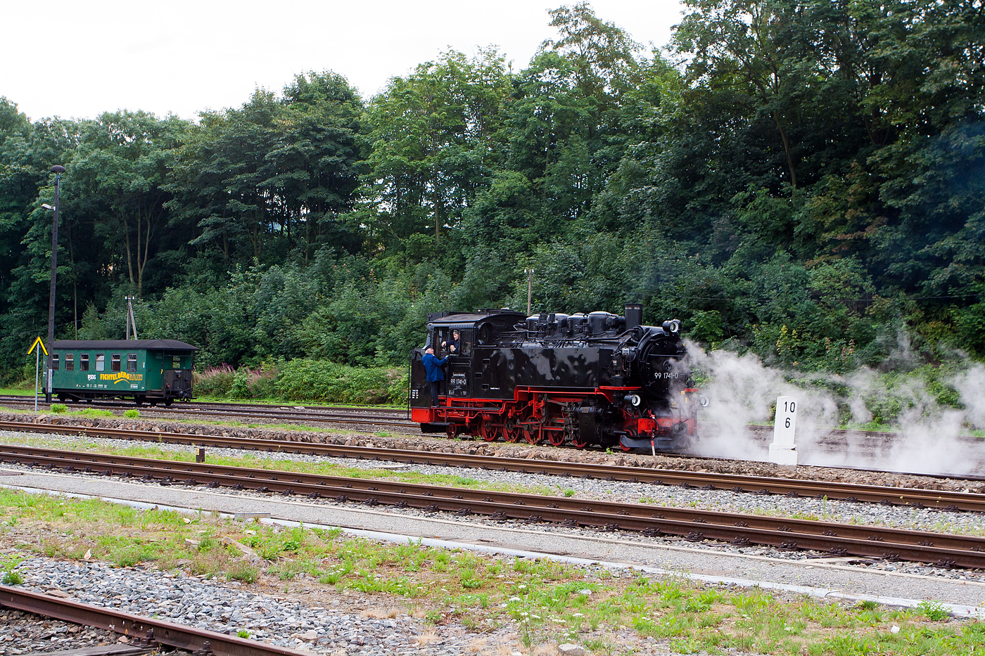 Die 99 741 der Weißeritztalbahn, hier ausgeliehen von der Fichtelbergbahn (ex DB 099 725-4, ex DR 99 1741-0) am 25.08.2013 beim Umsetzen im Bahnhof Oberwiesenthal.