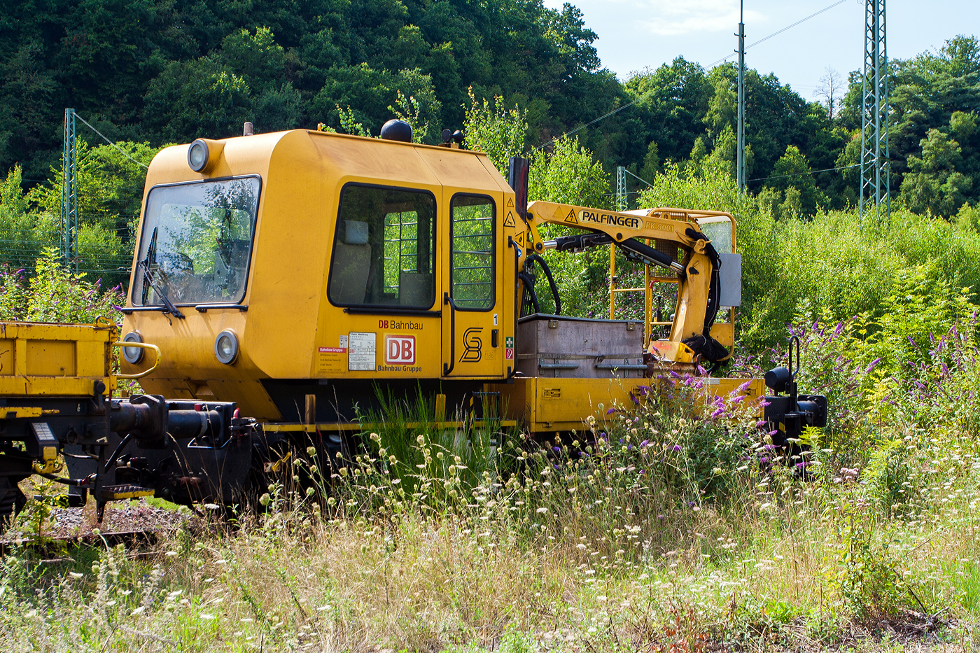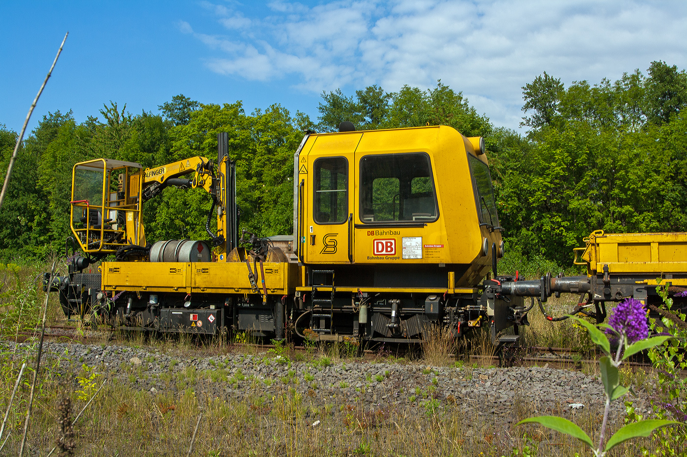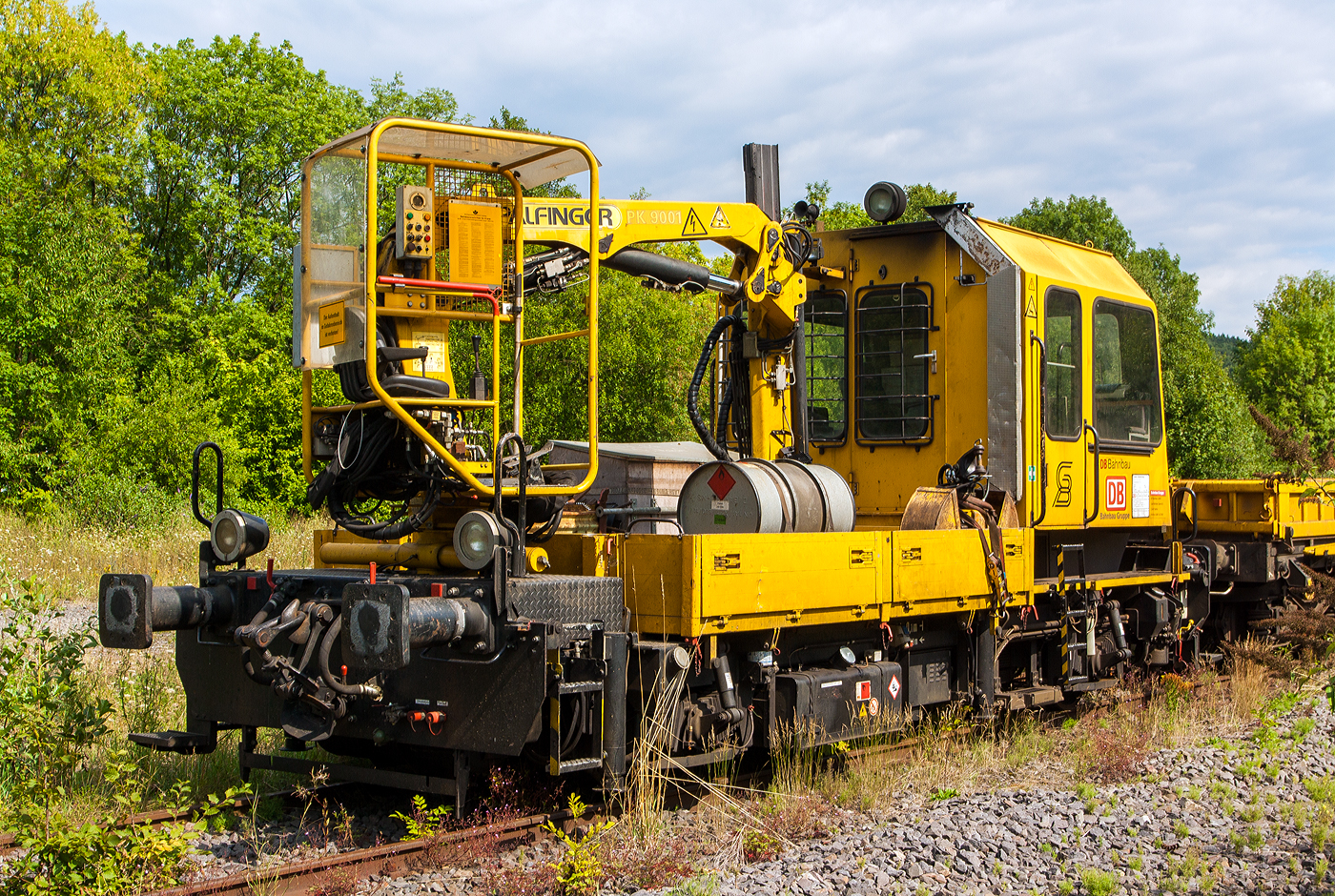 Die USM 641 eine Matisa Universal-Stopfmaschine B 66 U – D2 der DB Bahnbau Gruppe (Schweres Nebenfahrzeug Nr. 97 43 38 002 17-9), ex DB Netz AG, abgestellt am 11.07.2015 in Kreuztal, dahinter steht die SSP 911 eine Deutsche Plasser Schnellschotterplaniermaschine SSP 110 SW (Schweres Nebenfahrzeug Nr. 97 16 40 065 18-3) der DB Bahnbau Gruppe.
