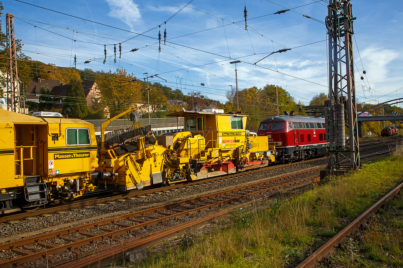 Luftbild von der Brücke auf die Plasser & Theurer Bettungsreinigungsmaschine RM 95-800 W, Schweres Nebenfahrzeug Nr. 99 80 9414 001-4 D-MWGB, der MGW Gleis- und Weichenbau-Gesellschaft mbH & Co. KG (Berlin) wartet am 14 Juli 2013 in (Burbach-) Würgendorf auf ihren Einsatz auf der Hellertalbahn (KBS 462), hinten rechts der Bahnhof. Vor der Maschine stehen noch einige Plasser & Theurer Materialförder- und Siloeinheiten MFS 100 der Schweerbau, die im Einsatz, von der Bettungsreinigungsmaschine mit nicht verwendbaren Altschotter (Abraum), befüllt werden.
