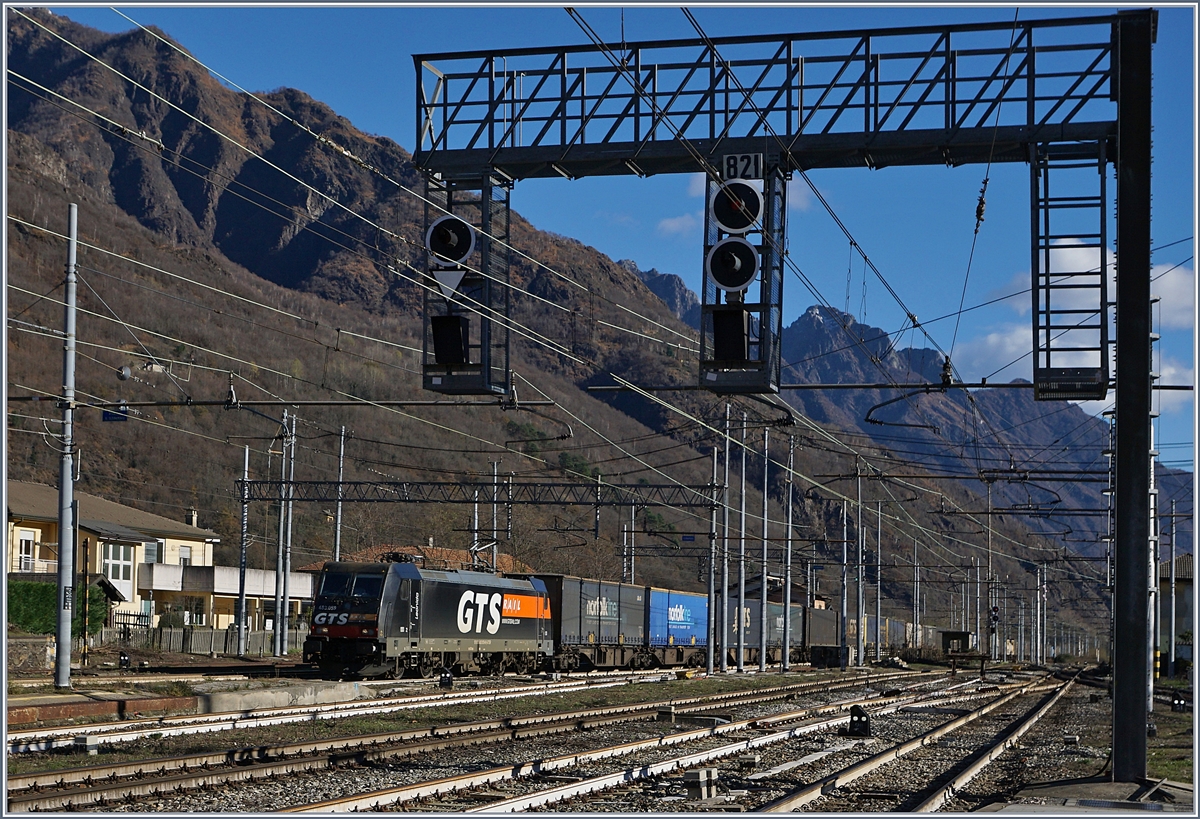 Die GTS-Rail 483 059 "Leonida" mit einen Güterzug bei der Durchfahrt in Premosselo Chiovenda. 4. Dezember 2018