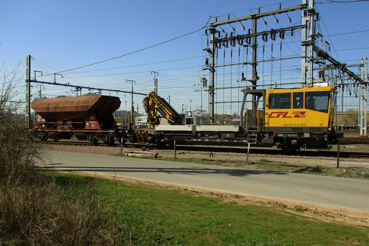 Der CFL Robel 781 ein Robel Interventions- und Instandhaltungsfahrzeug 57.54 (IIF), Schweres Nebenfahrzeug Nr. 99 82 9236 781-5 L-CFLIF (Véhicule secondaire lourd Nr.) der CFL Infrastruktur ist am 14.05.2016 in Kautenbach (Luxemburg) auf dem Gleis nach Wiltz mit einem Oberleitungsmontagezug abgestellt.