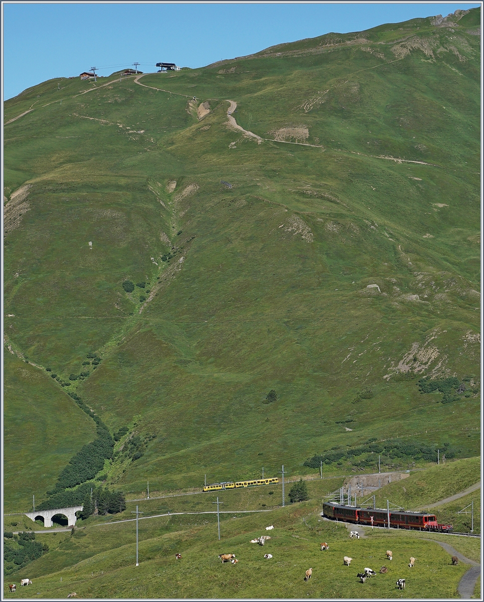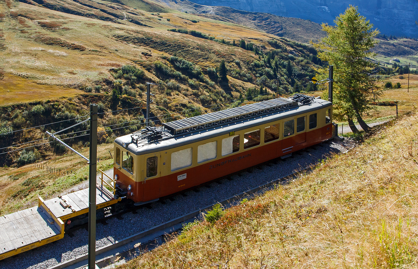 Der erste Blick auf den Bahnhof Kleine Scheidegg, aus dem Zug der WAB vor der Einfahrt am 02.10.2011. Bei dem traumhaften Wetter. Links der Bahnhof, davor Triebwagen der Jungfraubahn, Bildmitte das Hotel Bellevue des Alpes, dahinter das Wetterhorn.