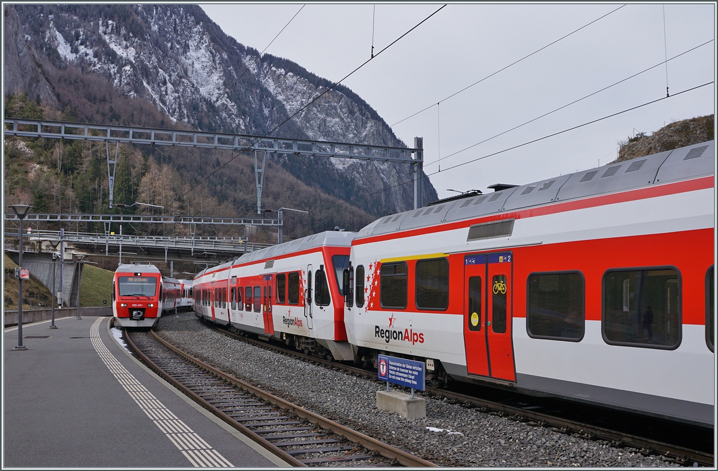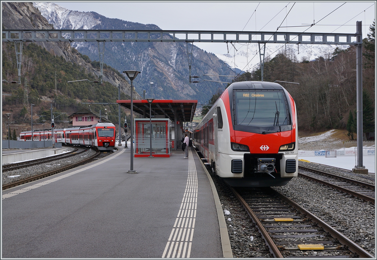 Nun werden sie wohl bald im Planbetrieb zu sehen sein die ersten neuen EVO RA Triebzüge, hier noch bei einer Testfahrt in Bex zu sehen: der neue RegionAlps RABe 533 703. Dahinter der SBB RABe 531 002. Interessanterweise ist der "RegionAlpes Triebzug trotz unterschiedlicher Farbgebung, einer anderen Einteilung der 1. Klasse und einer anderen Baureihen Bezeichnung ein SBB Triebzug, wie jedenfalls die UIC Nummer verkündet: RABe 94 85 0 533 703-0 CH-SBB.