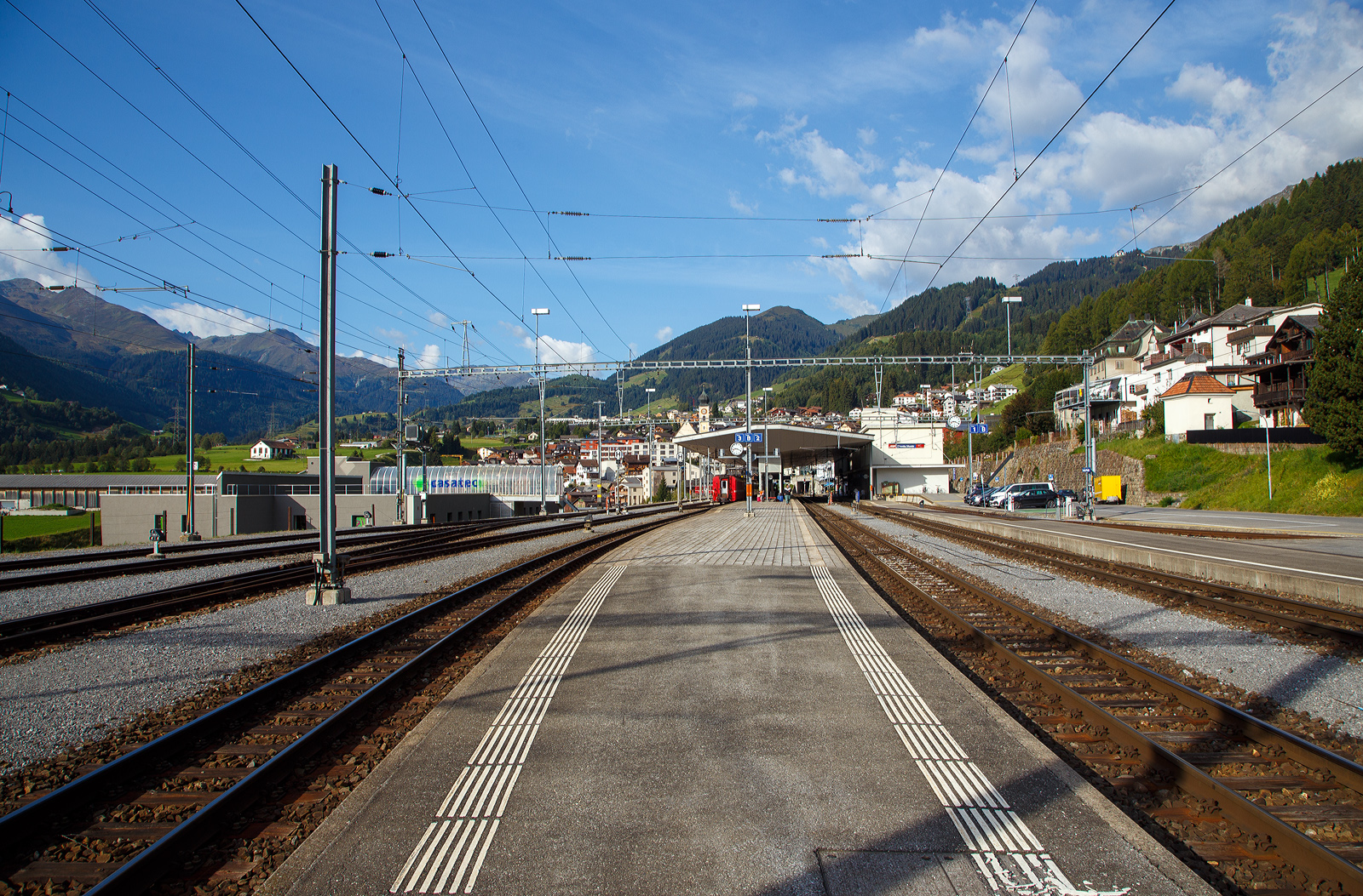 Der RhB und MGB Bahnhof der Klosterstadt Disentis/Mustér 1.130 m ü. M. am 07.September 2021, Blickrichtung Oberalppass. Der Bahnhof ist Endpunkt von der der Bahnstrecke Reichenau-Tamins – Disentis/Mustér auch Oberländerlinie, Surselvalinie oder Vorderrheinlinie (Fahrplanfeld 920) der Rhätischen Bahn (RhB). Er ist aber auch zugleich der Startpunkt Furka-Oberalp-Bahn (Fahrplanfeld 142 und 143) der Matterhorn-Gotthard-Bahn (MGB), bzw. bis zur Fusion (zum 01. Jan. 2003) der eigenständigen Furka-Oberalp-Bahn (FO). Die MGB Strecke geht von hier in Richtung Westen mit Zahnstangenabschnitten (bis zu 110 ‰ Neigung) über den Oberalppass nach Brig hinab. Für den berühmten durchgehenden Glacier-Express dient der Bahnhof somit auch dem Lokwechsel. Auch wenn beide Bahnen auf Meterspur fahren, so unterscheiden sich doch. Die Rhätischen Bahn (RhB) ist ja eine reine Adhäsionsbahn und die Matterhorn-Gotthard-Bahn (MGB) eine gemischte Zahnrad- und Adhäsionsbahn.