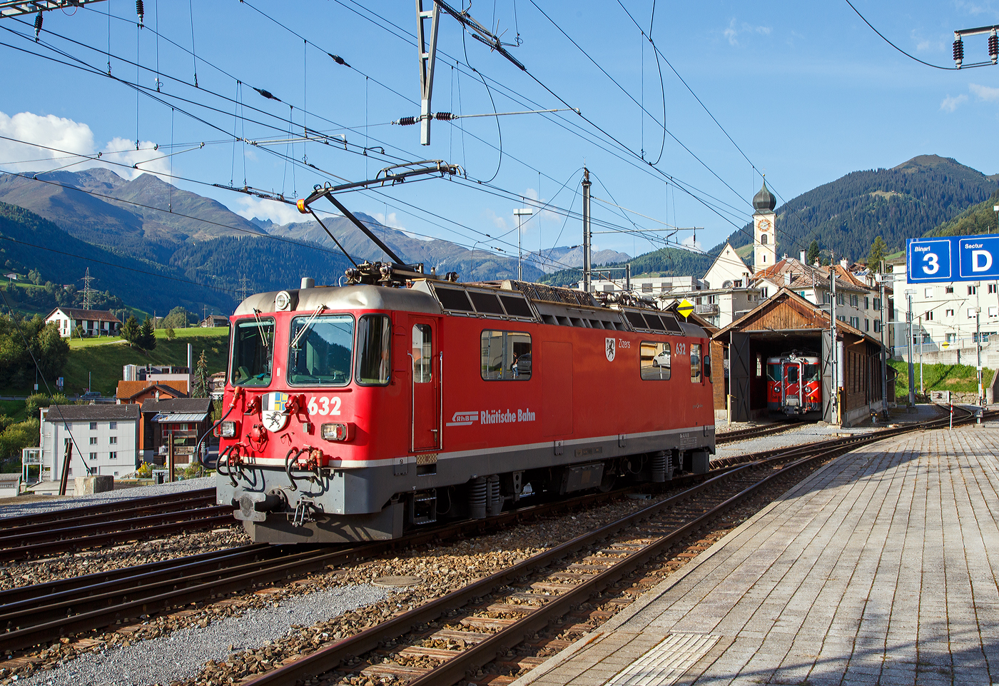 Die RhB Ge 4/4 II 632 „Zizers“ am 07 September 2021 beim Umsetzen im Bahnhof Disentis/Mustér. Zuvor hatte sie unseren Zug den RE 1721 von Chur nach hier gezogen. In Disentis/Mustér endet das Netz der Rhätischen Bahn (RhB), so setzt sich die Lok nun, für die Rückfahrt, ans andere Ende des Zuges. Hier in Disentis/Mustér endet das Netz der RhB, aber hier beginnt, mit direktem Anschluss, das Netz der Matterhorn-Gotthard-Bahn (MGB) bzw. bis zur Fusion (zum 01. Jan. 2003) der eigenständigen Furka-Oberalp-Bahn (FO). Bei den durchgängigen geneinsamen Zügen dem berühmten Glacier-Express, findet in Disentis/Mustér ein Lokwechsel, zwischen RhB und MGB, stand. Die RhB ist eine reine meterspurige Adhäsionsbahn im Gegensatz die MGB ist eine meterspurige Bahn mit gemischtem Adhäsions- und Zahnradbetrieb. Hinten in der Remise steht ein MGB Gepäcktriebwagen Deh 4/4 I, ex FO Deh 4/4 I, welche Fahrzeugnummer (51 bis 55) es ist kann in nicht sagen, da die Nummern an den Fronten nicht angeschrieben werden.