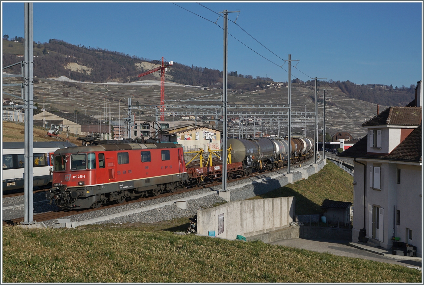 Am 26.02.2012 im Bahnhof Blonay: Auf Gleis 1 (rechts) steht der Be 2/6 - 7001 (Stadler GTW 2/6) der MVR (Transports Montreux–Vevey–Riviera) zur Abfahrt nach Vevey bereit, links auf Gleis 3 (dieses geht mit Zahnstange System Strub hinauf zum Les Pléiades 1.360 m ü. M) der Gepäcktriebwagen BDeh 2/4 Nr. 73 mit Steuerwagen Bt 222 der MVR.