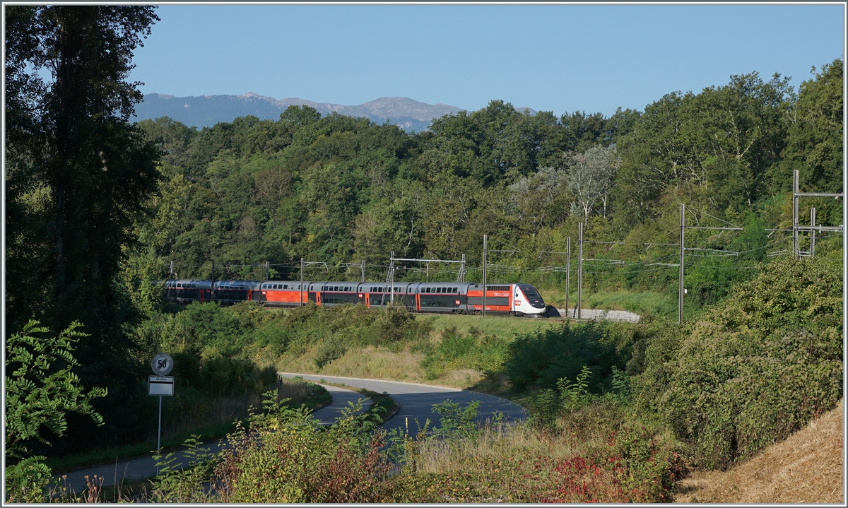 Der TGV 4725 ist als TGV Lyria 9261 kurz nach Arnex von Paris Gare de Lyon nach Lausanne unterwegs und somit schon fast am Ziel seiner Fahrt.