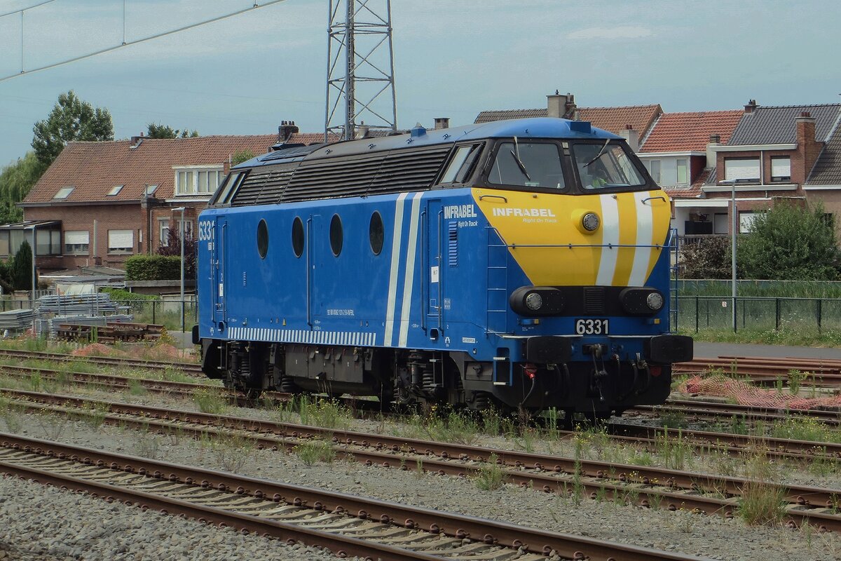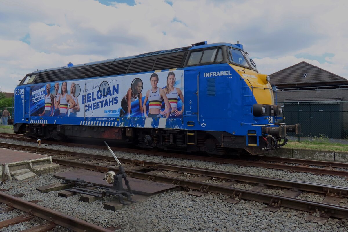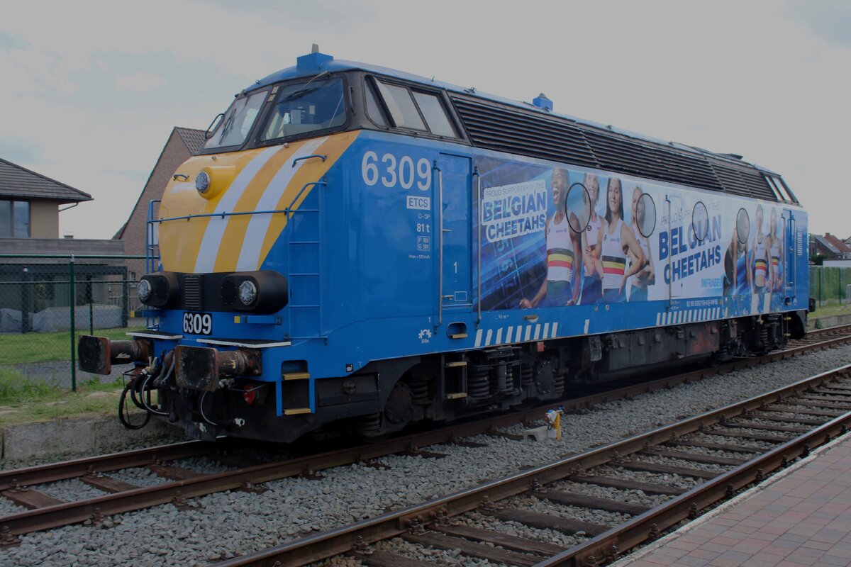 Ex-NMBS 6219 steht mit ein Pendelzug in Eeklo am grauen Nachmittag von 6 Mai 2023 und wird von offenbarer Pfad fotografiert während das Dampdwochenende der SCM.
