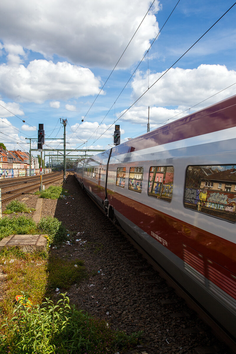 Der PBKA Thalys 4301 (TGV Series 43000) (93 88 0043 010-x B-TH etc.) fährt am 30.04.2023, als Thalys 9423 von Paris Gare du Nord (Paris Nord) via Bruxelles-Midi (Brüssel-Süd), Liège-Guillemins (Lüttich) und Aachen Hbf nach Köln Hbf, durch den Bahnhof Köln-Ehrenfeld in Richtung Köln Hbf, welchen er dann bald erreicht.