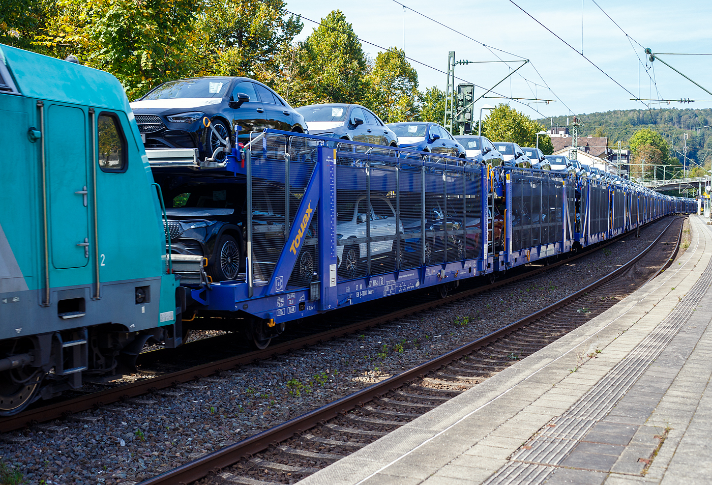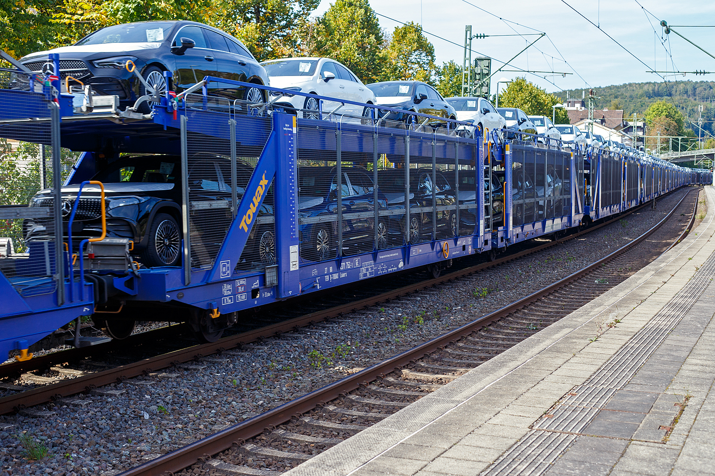 Vierachsige (2 x 2 achsiger) offener Doppelstock-Autotransportwagen (Wageneinheit) beladen PKW der Marke Mercedes-Benz, 23 88 4371 040-7 B-TOUAX, der Gattung Laaers, der irländischen Vermietungsfirma TOUAX Rail Limited (eingestellt in Belgien), am 22 September 2024 eingereiht im Zugverband bei einer Zugdurchfahrt im Bahnhof Kirchen (Sieg).