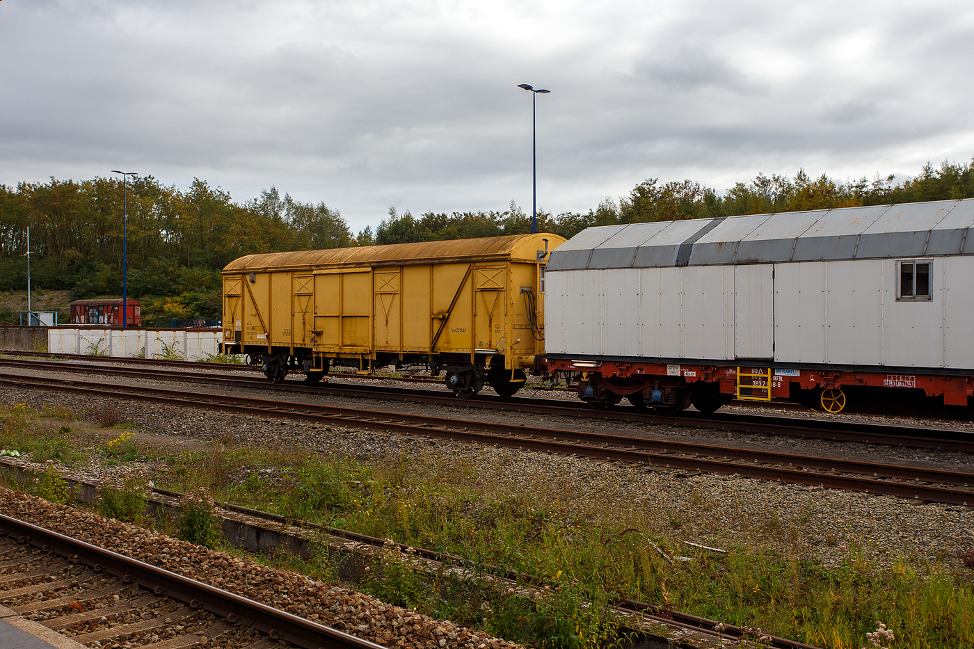Zweiachsiger gedeckter Güterwagen 40 88 1502 947-0 B-INFBL, der Gattung Gbs (Type 2216A8), des belgischen Infrastrukturunternehmens Infrabel, als Energiewagen (mit darin befindlichen Diesel-Generator) zu einem Wohnzug, abgestellt am 21 Oktober 2025 beim Bahnhof Ans.