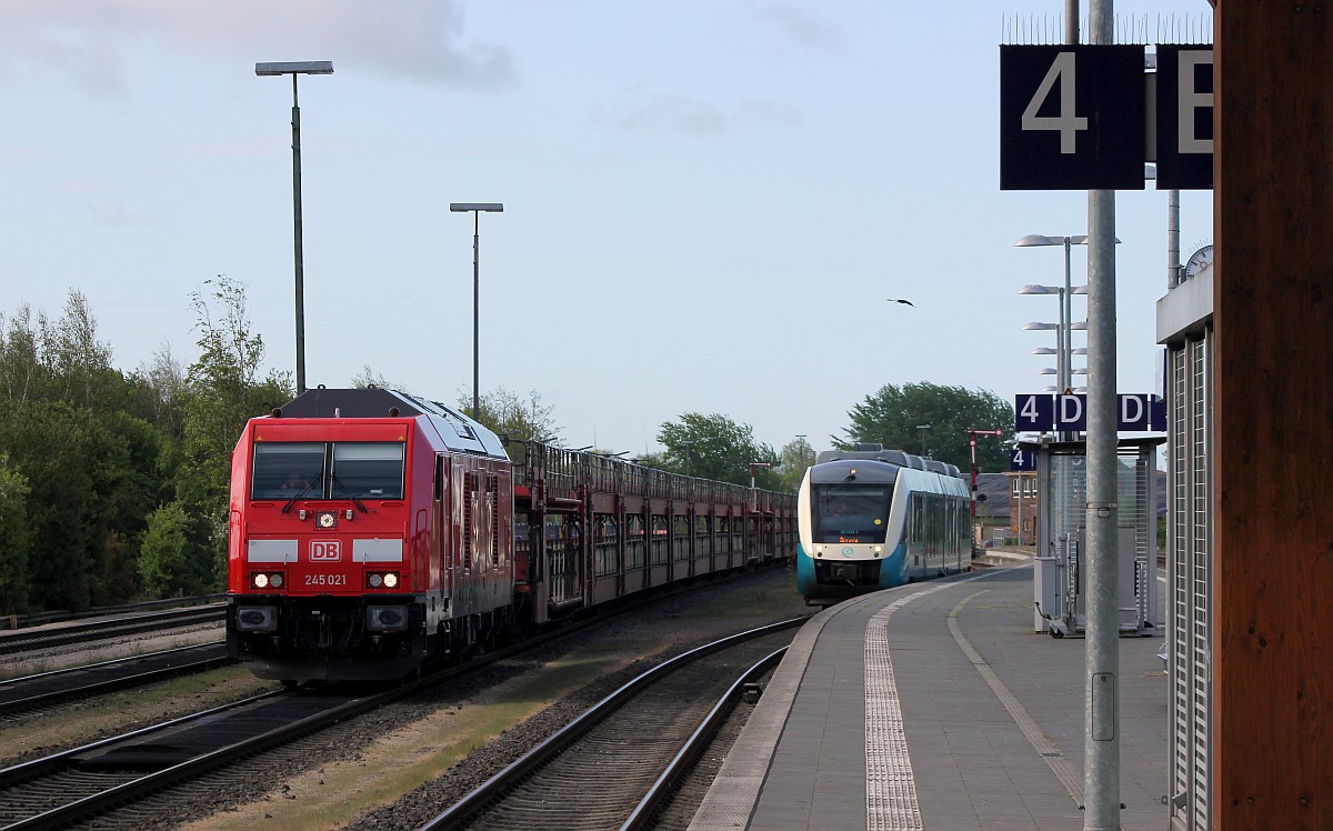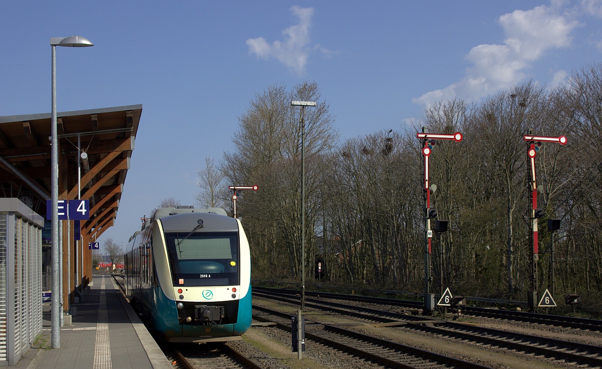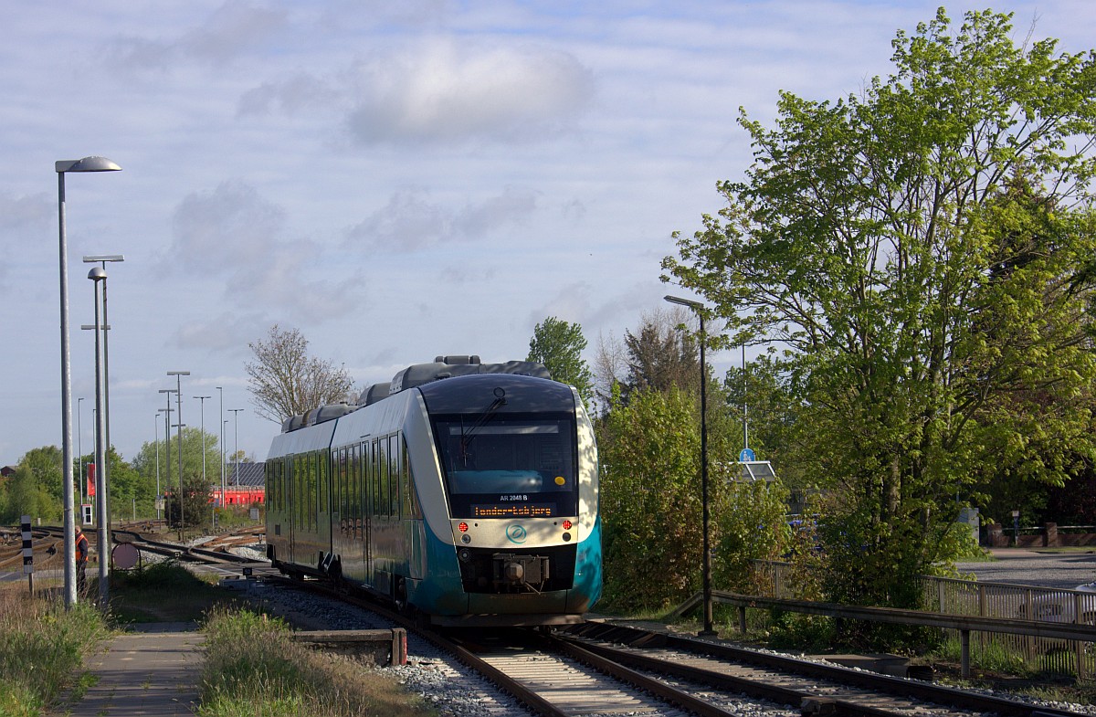 Arriva AR 05(9586 001 1005-9/002 1005-7)auf dem Weg nach Tønder/Esbjerg verlässt hier Niebüll(im Hintergrund zu sehen das "Grenz" Krankenhaus Niebüll). 15.03.2015
