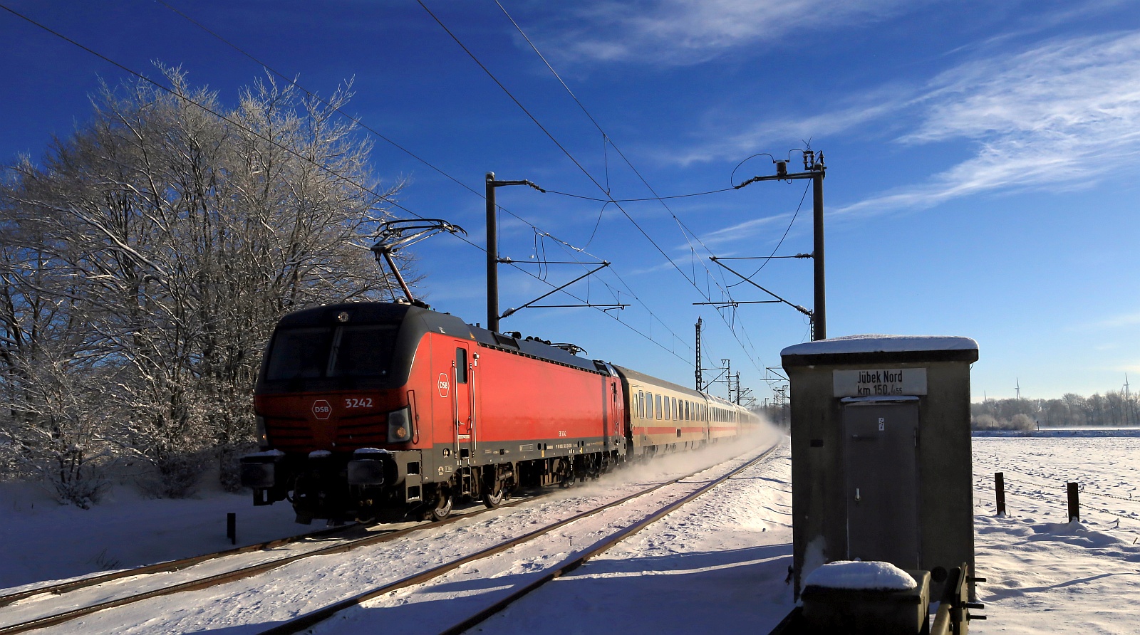 DSB Litra 3242 mit Eurocity nach Dänemark passiert hier den Bü Jübek-Nord am 04.01.2026
