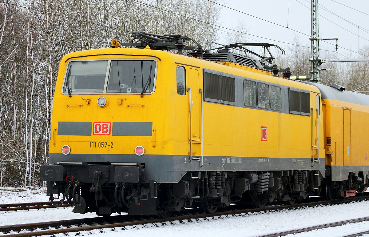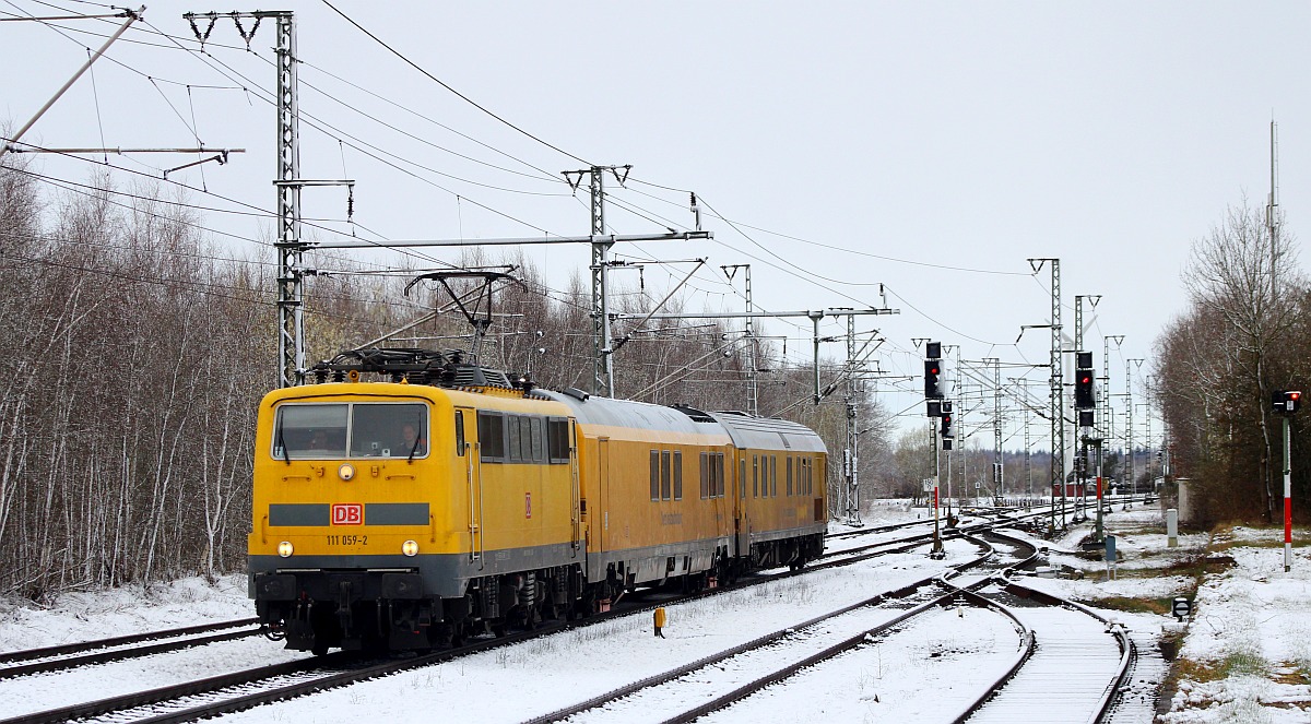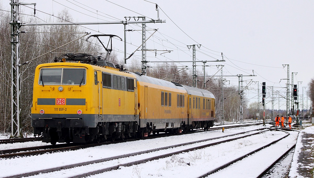 Messzug der DB Netz Instandhaltung...111 059-2 plus Railab 3 99 80-93 60 001-8(Messwagen Railab 3 BA 327.0 der DB Netz AG Maschinenpool, Berlin, ex A-ÖBB 73 81 88-95 002-1 WRmz, ex DB 73 80 88-95 038-6 WRmz 137.2, ex DB 61 80 88-94 536-4 WRbumz 139) plus Versorgungssteuerwagen 99 80 93-60 007-5(Versorgungssteuerwagen BR 721.1 der DB Netz AG Maschinenpool Berlin, Unt BCS X 10.03.16, ex 60 80 99-94 000-9 Dienst mz 307, ex 63 80 99-94 025-3 Dienst mz 307, ex Bimz Raw Halberstadt 1989/ABm65, EBA 05E20A001). Schleswig 07.09.2017