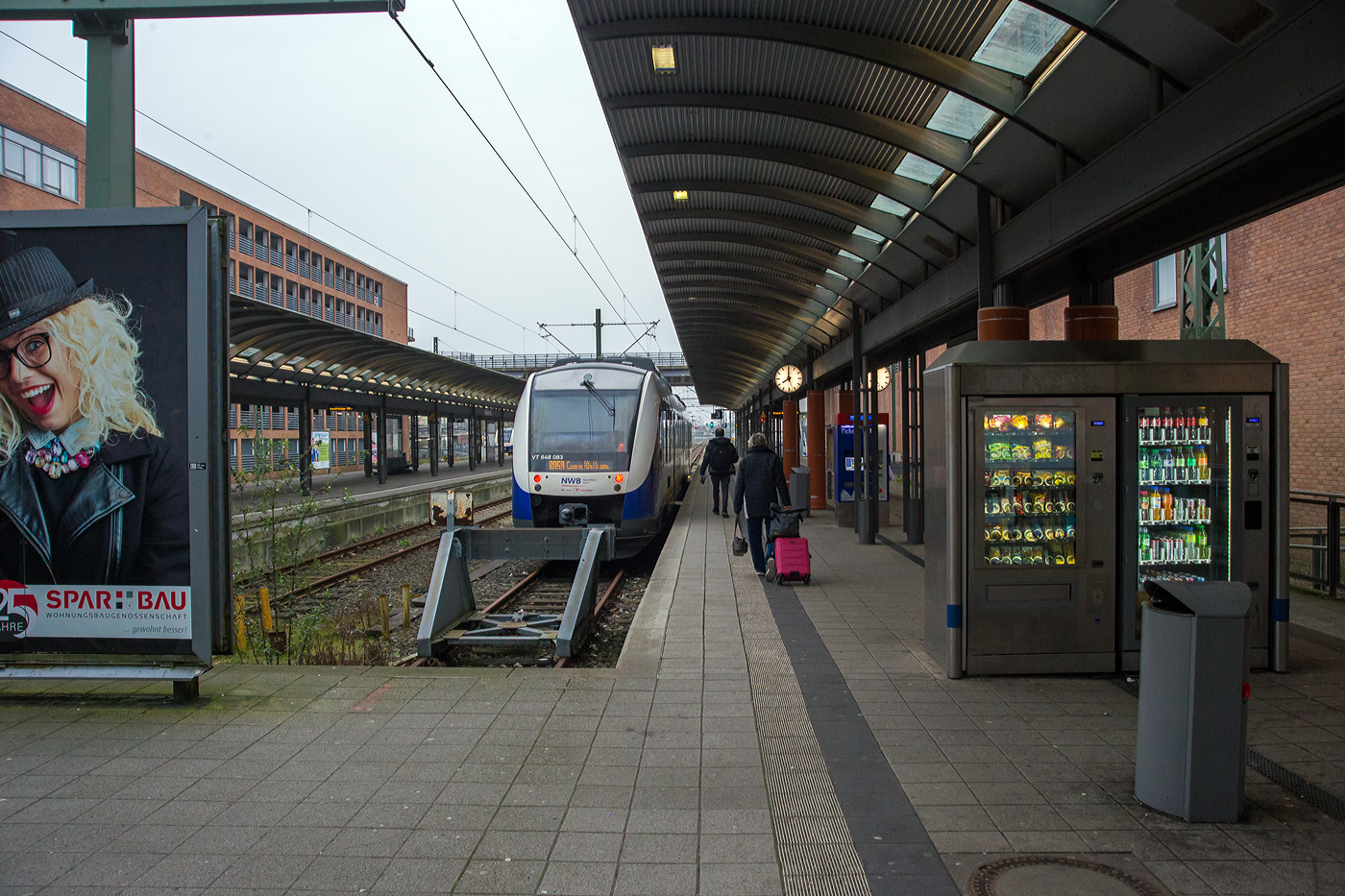 Sie haben uns am 10 März 2024 von Osnabrück nach Wilhelmshaven gebracht, nun stehen sie gleichdrauf für die Gegenrichtung (nach Osnabrück Hbf) bereit. Der VT 648 080 (95 80 0648 080-9 D-NWB / 95 80 0648 580-8 D-NWB), ex VT 510, gekuppelt mit dem VT 648 075 (95 80 0648 075-9 D-NWB / 95 80 0648 575-8 D-NWB), ex VT 505, zwei gekuppelte Alstom Coradia LINT 41der NWB - NordWestBahn GmbH (gehört zur Transdev), stehen am 10 März 2024,als RE 18 (Wilhelmshaven > Oldenburg Hbf > Osnabrück Hbf), im Bahnhof Wilhelmshaven zur Abfahrt bereit. Beide LINT 41wurden 2009 von der ALSTOM Transport Deutschland GmbH (vormals LHB - Linke-Hofmann-Busch GmbH) in Salzgitter-Watenstedt gebaut, der VT 648 075 unter der Fabriknummer 2000-505a/b, der VT 648 080 unter der Fabriknummer 2000-510a/b. Eigentlicher Eigentümer der beide Verbrennungstriebwagen ist aber die Landesnahverkehrsgesellschaft Niedersachsen mbH, Hannover (LNVG), die die Triebwagen für die Verkehrsleistung zur Verfügung gestellt. Bis Dezember 2006 wurden die LINT 41 als VT 505 bzw. VT 510 geführt.