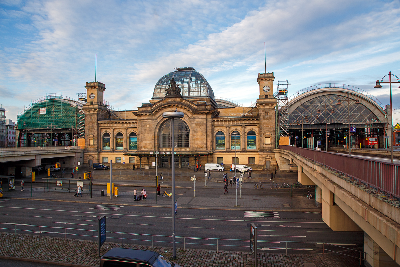 Der Hauptbahnhof Dresden Blickrichtung Westen am 08.12.2022, von links rechts Südhalle (Gleis 1-3), Mittelhalle (Gleis 4 bis 11) und die Nordhalle (Gleis 12 – 14). Dresden Hauptbahnhof ist der größte Personenbahnhof der sächsischen Landeshauptstadt Dresden. Er ersetzte 1898 den Böhmischen Bahnhof der einstigen Sächsisch-Böhmischen Staatseisenbahn und wurde mit seiner repräsentativen Gestaltung als zentraler Bahnhof der Stadt konzipiert. Eine Besonderheit ist die Kombination aus Insel- und Kopfbahnhof in zwei verschiedenen Ebenen. Die Hallen sind mit teflonbeschichteten Glasfaser-Membranen überdacht. Diese transluzente Dachgestaltung lässt seit der umfassenden Sanierung des Bahnhofs zu Beginn des 21. Jahrhunderts mehr Tageslicht als vorher in die Bahnhofshallen fallen. Der Hauptbahnhof verknüpft im Eisenbahnknoten Dresden die Strecken Dresden-Neustadt–Děčín hl. n. und Dresden–Werdau (Sachsen-Franken-Magistrale) miteinander, die den Verkehr nach Südosten in Richtung Prag, Wien und weiter nach Südosteuropa ermöglichen, sowie nach Südwesten in Richtung Chemnitz weiter nach Nürnberg. Der Hauptbahnhof befindet sich südlich der Altstadt in der Seevorstadt; an seiner Südseite grenzt das Schweizer Viertel der Südvorstadt an. Direkt neben dem Bahnhofsgelände befindet sich die Hochschule für Technik und Wirtschaft. Die Bundesstraße 170 unterquert in Nord-Süd-Richtung das Bahnhofsgelände östlich des Empfangsgebäudes. Nach Norden hin beginnt über den Wiener Platz die Prager Straße, die innerstädtische Einkaufsmeile der Stadt. Der Straßenverkehr am Wiener Platz wird seit den 1990er Jahren durch einen Straßentunnel mit Tiefgarage geleitet, der Platz ist seitdem Fußgängerzone. Im Umfeld entstanden verschiedene größere Büro-, Geschäfts- und Wohngebäude in modernem Stil. Bahnsteige Das Mittelschiff bildet heute einen Kopfbahnhof mit sieben Gleisen aus Richtung Nordwesten. Die Bahnsteiggleise des Mittelteils liegen ungefähr auf Straßenniveau, alle Durchgangsgleise verlaufen in einer zweiten Ebene 4,50 Meter darüber. Die Nord- und Südhalle beherbergen je drei durchgehende Bahnsteiggleise, die in südöstlicher Richtung über das Hallenende hinaus reichen. An den Bahnsteigen 1 und 2 werden diese Abschnitte auch als Bahnsteig 1a und 2a bezeichnet. Der Ostbau besaß ursprünglich je ein Bahnsteiggleis in Kopflage an seinen äußeren Seiten. Heute ist jedoch nur noch Gleis 4 in Nutzung. Südlich der Südhalle befinden sich seit der Sanierung im neuen Jahrtausend, zwei durchgehende Güterzuggleise.