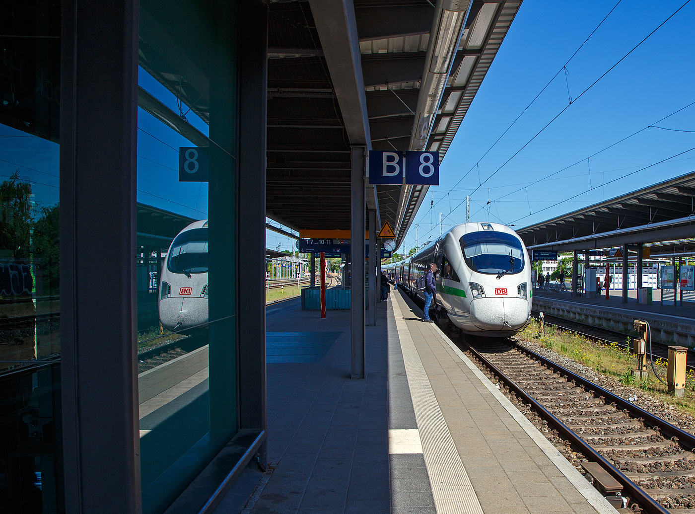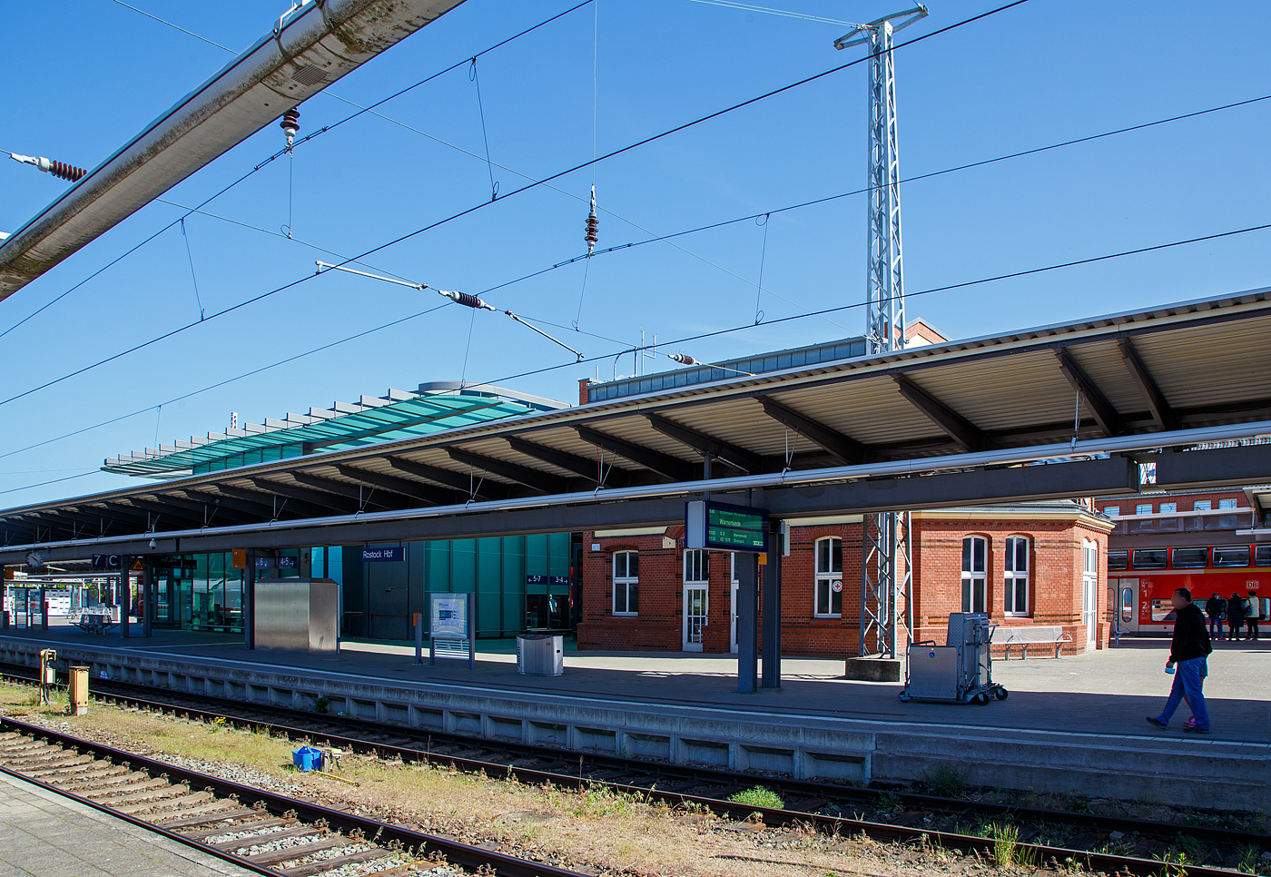 Der volle Mond steht am 14.05.2022 über dem Empfangsgebäude vom Hauptbahnhof Rostock.