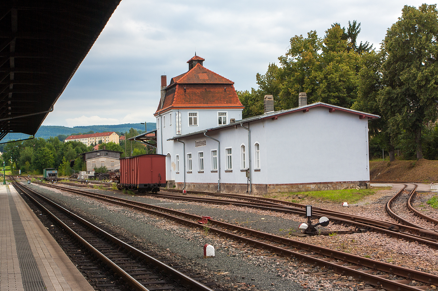 Seitlicher Blick (vom Zughotel) auf den Bahnhof Wolkenstein (Erzgebirge) am 26 August 2013.