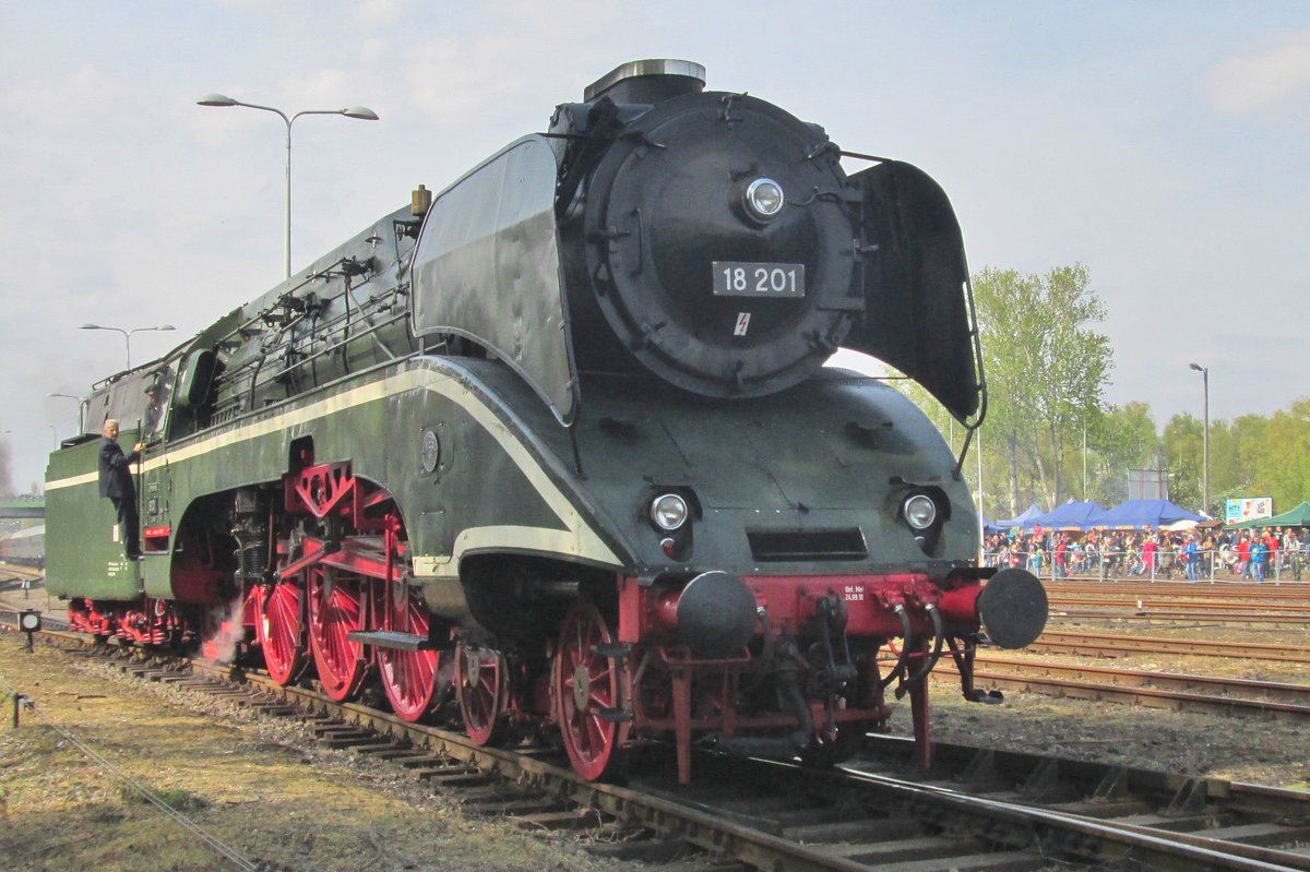 Einfach eine Schönheit.... Die 18 201 (ex DR 18 201 ex DR 02 0201-0) der Dampf Plus steht am 24.08.2013 im Dampflokwerk Meiningen (DLW). Sie ist, mit einer Höchstgeschwindigkeit von 182,5 km/h, die schnellste betriebsfähige Dampflokomotive der Welt. Sie hat mit 2,3 m Durchmesser mächtig große Treibräder. Zudem ist sie ein Unikat, diese Lok gab und gibt es nur einmal auf der Welt. Die Schnellzuglokomotive mit der Nummer 18 201 der Deutschen Reichsbahn entstand 1960 bis 1961 im Reichsbahnausbesserungswerk Meiningen aus Teilen der Henschel-Wegmann-Zug-Lokomotive 61 002, dem Schlepptender der 44 468 und Teilen der H 45 024 und einer Lokomotive der DR-Baureihe 41. Sie war eine der schnellsten betriebsfähigen Dampflokomotiven der Welt. Die Motive für den Umbau waren zum einen, dass die bereits seit Jahren abgestellte 61 002 als Einzelstück kaum im Plandienst zu gebrauchen war, zum anderen, dass die VES-M Halle dringend Schnellfahrlokomotiven für eine Geschwindigkeit von mindestens 160 km/h benötigte, um Probefahrten mit für den Export bestimmten Reisezugwagen der einheimischen Waggonbau-Industrie durchzuführen. Mit ihren 2.300 mm großen Treibrädern bot sich die 1939 bei Henschel & Sohn gebaute 61 002 für einen solchen Umbau an. Der Umbau war von dem Leiter der Fahrzeugversuchsanstalt Halle Max Baumberg initiiert worden. Von der 61 002 wurde der vordere Rahmenteil (Barrenrahmen) und das Trieb- und Fahrwerk bis zur dritten Kuppelachse übernommen. Der Rahmen für das hintere Bisselgestell, der hintere Kuppelkasten sowie die Außenzylinder stammten von der misslungenen Hochdrucklokomotive H 45 024. Der hintere Rahmen wurde in Anlehnung an den Rahmen der H 45 024 neu als Blechrahmen konstruiert und an den vorderen Barrenrahmen angeschweißt. Der Rahmen der H 45 024 konnte nicht verwendet werden, da dessen Wangenstärke von 100 mm nicht zu den 80 mm des Barrenrahmens der 61 002 passte. Der Innenzylinder wurde durch eine Neukonstruktion ersetzt. Der Ersatz der Zylinder war notwendig, da die ursprüngliche Dampfmaschine der Baureihe 61 einen Druck von 20 bar erforderte, passende Kessel aber wegen Material- und Unterhaltungsproblemen keine ausreichende Lebensdauer erreichten. Als Dampferzeuger kam der Neubaukessel 39 E zum Einsatz, welcher auch in den Baureihen 03, 22 und 41 Verwendung fand. Der Tender war zuvor mit der 44 468 gelaufen. Die Lok erhielt auch, wie zu dieser Zeit üblich, einen Giesl-Ejektor. Um die Maschine wieder unter Dampf zu setzen, gründeten der Unternehmer Christian Goldschagg und der Musiker Axel Zwingenberger zunächst die Initiative Rettet die 18 201 und anschließend die Dampf-Plus GmbH. Mit dem Geld dieser Firma wurde die Lok im Dampflokwerk Meiningen vollständig aufgearbeitet und am 4. April 2002 den Investoren übergeben. Dampf-Plus hatte als Geldgeber in diesem Zusammenhang mit dem DB Museum einen Kooperationsvertrag geschlossen, um die Investitionssumme durch Nutzungsrechte an der Lok mittels Vermarktungskonzepten gewinnbringend wieder einzuspielen und am Erhalt der 18 201 maßgeblich mitzuwirken. In der Folge kam es zu einem Streit über die Wahrung der Vertragsinhalte mit der Deutschen Bahn AG, wobei es auch darum ging, dass aus Sicherheitsgründen nur DB-Stammpersonal die Lokomotive bedienen durfte. Im März 2004 wurden die Kooperationsverträge endgültig aufgehoben, wobei die DB weiterhin auf ihr Recht der Personalgestellung pochte. Ab dem 28. Februar 2004 war Dampf-Plus Eigentümer der Lokomotive und versuchte in der Folge, die Lokomotive wieder zu verkaufen, um die Verluste des Unternehmens zu kompensieren. Zwischen dem 30. April 2002 und dem 10. Juli 2005 war die traditionell in Grün lackierte Maschine in einer roten Sonderlackierung RAL 3003 (Rubinrot) unterwegs, die der Modellbahnhersteller Roco für diesen Zeitraum gesponsert hatte. Nach dieser Vermarktungskampagne erhielt 18 201 eine chromoxidgrüne Färbung RAL 6020. Nach der Aufarbeitung war die unter Denkmalschutz stehende Lokomotive bis zum 30. April 2012 im Ringlokschuppen des ehemaligen Bahnbetriebswerks Nossen untergebracht und wurde danach in Wittenberg stationiert. Von 2010 bis 2015 war sie durch die Deutsche Museums-Eisenbahn im nationalen Fahrzeugeinstellungsregister angemeldet. Seit 2015 ist die Lokomotive durch die Sonderzugveranstaltungen in Chemnitz registriert. Im Jahr 2005 ging die Lokomotive in das Privateigentum von Christian Goldschagg über, nachdem die Dampf-Plus GmbH die eigenständige Vermarktung aus wirtschaftlichen Gründen aufgeben musste. Goldschagg hat nach der Übernahme alle Mitarbeiter der Dampf-Plus GmbH entlassen, um die Lokomotive direkt über seinen Münchener Mietservice zu vermarkten. Ende 2018 liefen bei der denkmalgeschützten Lok 18 201 sämtliche Fristen an Fahrwerk und Kessel nach acht Jahren seit der letzten Hauptuntersuchung aus. Am 1. September fand noch eine große Abschiedsfahrt statt. Die Lokomotive wurde zunächst unzugänglich in einem Lokschuppen Wittenberg konserviert abgestellt. Am 14. August 2019 wurde die 18 201 wegen Geschäftsaufgabe der Dampf-Plus GmbH an die WFL GmbH & Co. KG, Potsdam verkauft. Der neue Eigentümer WFL hat im November 2019 die Lokomotive in das AW Neustrelitz zur Erledigung von Teilgewerken unter anderem an der Bremsanlagen von Lok und Tender im Rahmen der notwendigen gesetzlichen Hauptuntersuchung zur Wiederinbetriebnahme überführen lassen. Im September 2020 kehrte sie aus dem AW Neustrelitz in ihr Heimat-BW Nossen zurück, wo nun die weiteren Arbeiten der Hauptuntersuchung zur Erlangung der neuen Zulassung im Streckendienst durchgeführt werden. Nach erfolgreicher Zulassung für den Betriebsdienst steht die Lokomotive für Sonderfahrten wieder zur Verfügung. TECHNISCHE DATEN: Spurweite: 1.435 mm (Normalspur) Achsformel: 2’C1’ Gattung: S 36.20 Länge über Puffer: 25.145 mm Leergewicht: 102,5 t Dienstgewicht: 113,6 t Dienstgewicht mit Tender: 186,8 t (mit vollen Vorräten) Höchstgeschwindigkeit: 182,5 km/h 