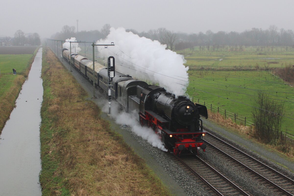 Wie jedem Jahr fahrt VSM auch in 2023 einige Dampfpendelzüge zwischen Arnhem und ein andere Stadt. Diesmal wurde Nijmegen erkoren. Am 16 Dezember 2023 durchfahrt der Dampfpendelzug mit 23 076 Elst -gerade mitten ins Strecke Nijmegen-Arnhem. Das Bild wurde vom Füssgangerbrücke gemacht.