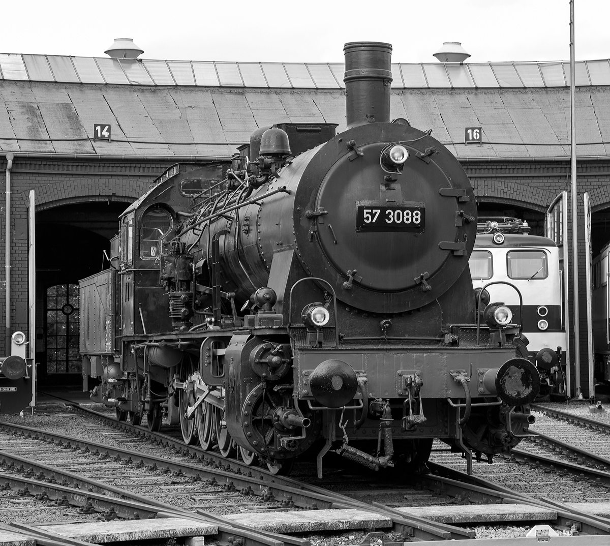 Siegen wie anno 1963 - Die Schlepptender-Güterzuglokomotive 57 3088 (preuß. G10), Baujahr 1922 bei Rheinmetall, am 18.08.2012 im Südwestfälische Eisenbahnmuseum in Siegen, hier steht sie vor dem Gebäude der ehemaligen Lokleitung des Bw Siegen. Kurz vor der z-Stellung am 10.06.1968 wurde sie zum 01.01.1968 noch in 057 088 umgezeichnet. Am 24.06.1970 schied sie aus dem Bestand der DB aus. Von 1974 bis 2002 war sie als Denkmal auf dem Gelände des Bahnbetriebswerks Haltingen aufgestellt. Ein paar Daten zur G10 noch: Die Bauart ist E h2, Gattung G 55.15, sie hat eine Leitung von 1.100 PS die sie auf eine Höchstgeschwindigkeit von 60 km/h bringen.