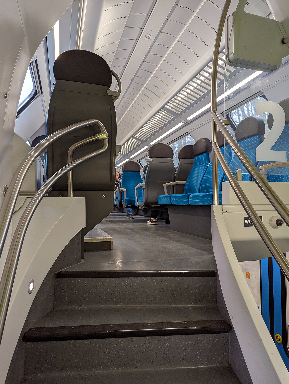 Innenraum des sechsteiligen Doppelstocktriebwagen Stadler KISS (160) - ET 610 (94 80 0445 010-2 D-WFB ff.) der WestfalenBahn, hier Blick von der Treppe ins Oberdeck.