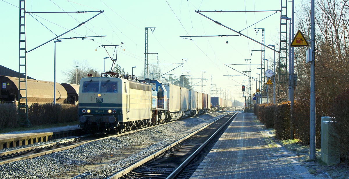 SEL 181 211 mit neg 575 003 und dem Nordliner nach Pattburg/DK. Jübek 06.01.2022