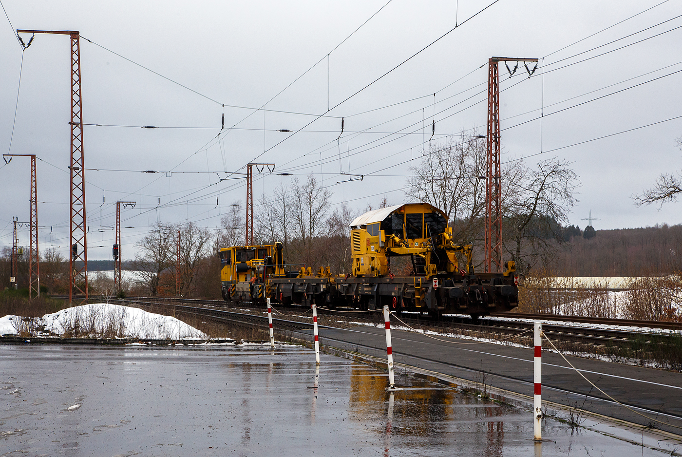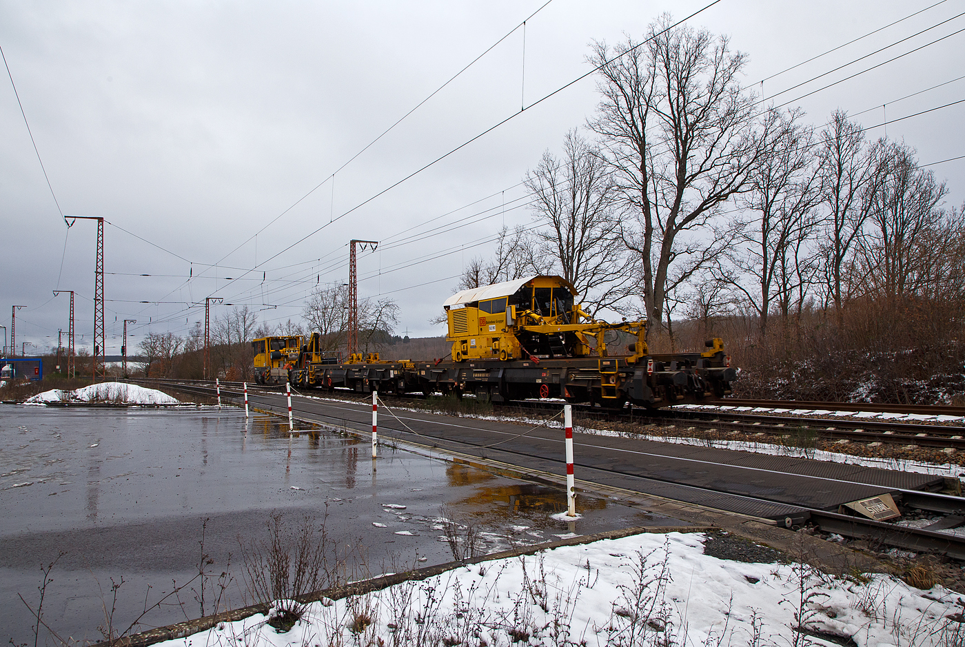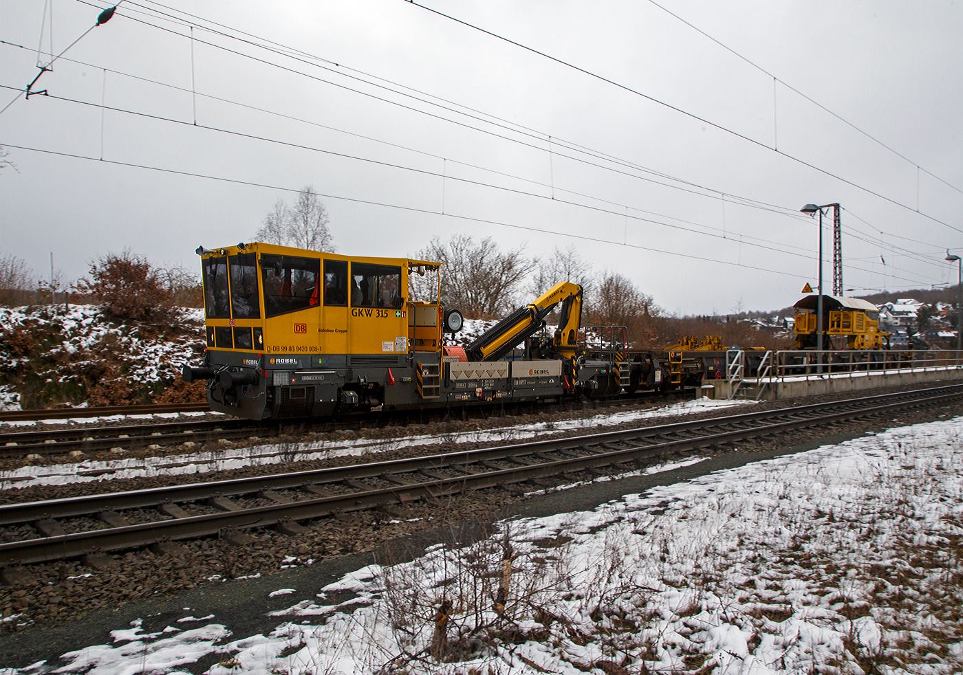Der Gleiskraftwagen GKW 315 / D-DB 99 80 9420 008-1, ex Schweres Nebenfahrzeug Nr. 97 17 56 028 17-3, ein Gleisarbeitsfahrzeug Robel BAMOWAG 54.22 der DB Bahnbau Gruppe GmbH, rauscht am 27.01.2023, mit der Schienenladezug SLE 993 / D-DB 99 80 9351 002-7 (Rutschenwagen 1 mit Schienenmanipulator und Rutschenwagen 2) der DB Bahnbau Gruppe, einer Schienenzugladeeinrichtung vom Typ Robel SILAD 40.61- RW1, durch Wilnsdorf-Rudersdorf in Richtung Siegen. Das Gleisarbeitsfahrzeug (GKW 315) Robel 54.22 wurde 2004 von der ROBEL Bahnbaumaschinen GmbH (Freilassing) unter der Fabrik-Nr. 54.22 – 32 - BH011 gebaut. TECHNISCHE DATEN: Spurweite: 1.435 mm Achsanordnung: B Länge über Puffer: 13.100 mm Achsstand: 7.500 mm Treibraddurchmesser (neu): 840 mm Höchstgeschwindigkeit: 100 km/h Zur Mitfahrt zugelassene Personen: 6 Eigengewicht: 30 t Nutzlast: 5 t Bremse: KE-GP mZ Kleinster befahrbarer Gleisbogen: R = 80m Zugelassen für Streckenklasse: C2, CM2 und höher Hydraulischer Ladekran Typ: Palfinger PK21502, max. Hubmoment 197,5 kNm (20,1 mt), max. Reichweite hydraulisch 21,3 m Der Schienenladezug (SLE 993) wurde 2011 von der ROBEL Bahnbaumaschinen GmbH (Freilassing) gebaut. TECHNISCHE DATEN des ROBEL Schienenmanipulator SILAD 40.6: Spurweite: 2.864 mm Motor: 4-Zylinder-Dieselmotor Antriebsart: Diesel hydrostatisch (d.h. der Dieselmotor triebt ein Hydraulikaggregat an, welches Hydraulikmotore (Hydromotore) antreibt. Höchstgeschwindigkeit: 10 km/h Max. Zugkraft bei 10 km/h: 11.800N Max. Zugkraft bei 0-4 km/h: 3.300 N Eigengewicht : 13.600 kg Ladezeiten pro Schienenpaar (180 m lang): Aufladen ca. 4 min / Abladen ca. 2 min Schienengewicht: bis zu 70 kg/m Hubkraft je Schienengreiferarm bei 3,7 m Ausladung: 15.000 N (1.500 kg) Schwenkkraft je Schienengreiferarm: 1000 N Max. Schienenlänge: 250 m (übliche Längen 120 und 180 m) Technische Daten der Rutschenwagen: Spurweite: 1.435 mm Länge über Puffer: 14.500 mm Achsabstand: 9.000 mm Höchstgeschwindigkeit: 100 km/h Eigengewicht Rutschenwagen 1: 21.100 kg (ohne SM) / 34,7 t mit SM Eigengewicht Rutschenwagen 2: 30.100 kg