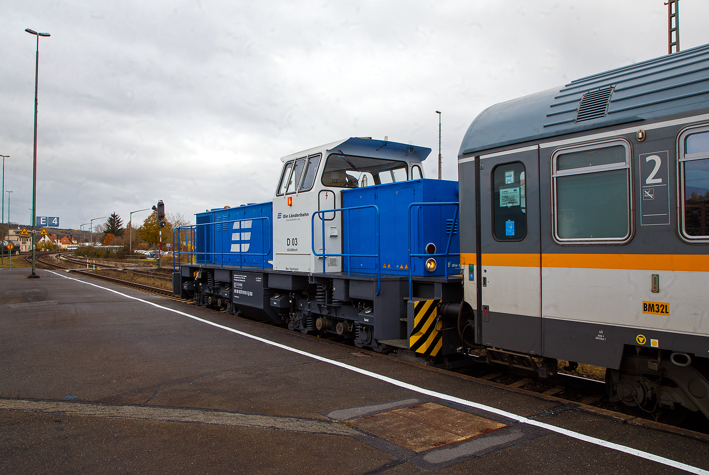 Die D 03 alias 270 010-8 (98 80 0270 010-8 D-DLB) eine MaK G 1202 BB der DLB - Die Länderbahn GmbH, ex D III der Regentalbahn AG, hat am 24.11.2022 im Bahnhof Schwandorf den weiter als RE 25 geführten alex-Zug bereitgestellt. An dem seitlichen gelben Licht am Führerhaus, kann man erkennen, die Lok wird über die Funk-Fernsteuerung gesteuert wird. Aus betriebsbedingten Gründen wurde für den alex RE 25 (Praha – Plzeň - Furth i.W. - Schwandorf – Regensburg – München), in Tschechien als EC 360 / Ex 6 geführt, in Schwandorf ein anderer Zug für die Weiterfahrt über Regensburg nach München bereitgestellt. So musste man umsteigen und den Bahnsteig 2 auf 4 wechseln. Die MaK G 1202 BB wurde 1980 von MaK in Kiel unter der Fabriknummer 1000789 gebaut und am die Regentalbahn AG geliefert. Seit 2015 firmieren die Töchter der Regentalbahn als DLB - Die Länderbahn GmbH. Die Lokomotive MaK G 1202 BB ist eine dieselhydraulische Lokomotive, die von der Maschinenbau Kiel (MaK) gebaut wurde. Sie hat eine Leistung von 1.000 kW (ältere 945 kW) und erreicht eine maximale Geschwindigkeit von 60 km/h. Das Dienstgewicht der Lok beträgt ja nach Aufführung 72 - 88 t, diese hier hat durch Ballastgewichte ein Dienstgewicht von 80 t (ohne Zusatzgewichte 72 t). Die leistungsstärkere G 1202 BB war deutlich erfolgreicher als die G 1201 BB. Als ab 1981 die stärkeren MTU-Motoren der Reihe 396 eingebaut wurden, wurde die Typenbezeichnung in G 1204 BB geändert. TECHNISCHE DATEN: Gebaute Anzahl: 12 Spurweite: 1.435 mm (Normalspur) Achsformel: B'B' Länge über Puffer: 12.500 mm Drehzapfenabstand: 5.800 mm Achsabstand im Drehgestell: 2.400 mm größte Breite: 3100 mm größte Höhe über Schienenoberkante: 4.220 mm Raddurchmesser neu: 1.000 mm kleinster befahrbarer Gleisbogen: 60 m Dienstgewicht: 80 t (ohne Ballastgewichte 72 t) Kraftstoffvorrat: 2.500 l Motor: MTU-V12-Zylinder-Dieselmotor mit Common-Rail-Einspritzung, Abgasturboaufladung und Ladeluftkühlung vom Typ MTU 12V 396 TC12 (ältere MTU 12V 331 TC11) Leistung: 1.000 kW (ältere 945 kW) Getriebe: Voith L5r4U2 Höchstgeschwindigkeit: 60 km/h (andere Ausführungen 40 – 75 km)