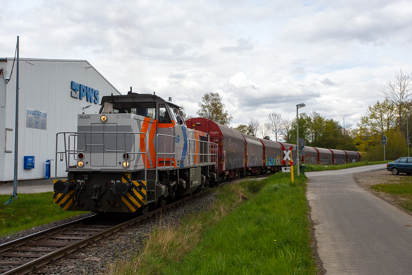 Ein langer und schwerer Coilzug im Sandwich der Kreisbahn Siegen-Wittgenstein hat am 16 April 2026 Herdorf erreicht und es geht direkt durch den KSW-Rangierbahnhof und auf der KSW-Infrastruktur (Betriebsstätte FGE - Freien Grunder Eisenbahn) weiter in Richtung Neunkirchen-Salchendorf. Vorne die führende KSW 45 (98 80 0276 016-9 D-KSW) die MaK G 1204 BB. Hier am Zugschluss ist die nachschiebende KSW 42 (92 80 1277 902-3 D-KSW), eine Vossloh MaK G 1700 BB. So kann der komplette Zug aber nicht an sein Ziel hinauf zum Pfannenberg fahren, denn er muss durch die Spitzkehre Pfannenberg. So muss der Zug in mehreren Abschnitten geteilt werden und eine Lok bringt die Coilwagen hinauf. Oben befindet sich die ehemalige Grube Pfannenberger Einigkeit, wo sich heute die Produktionshallen der EMW Stahl Service GmbH ein Geschäftsbereich der SCHÄFER WERKE Gruppe befinden.
