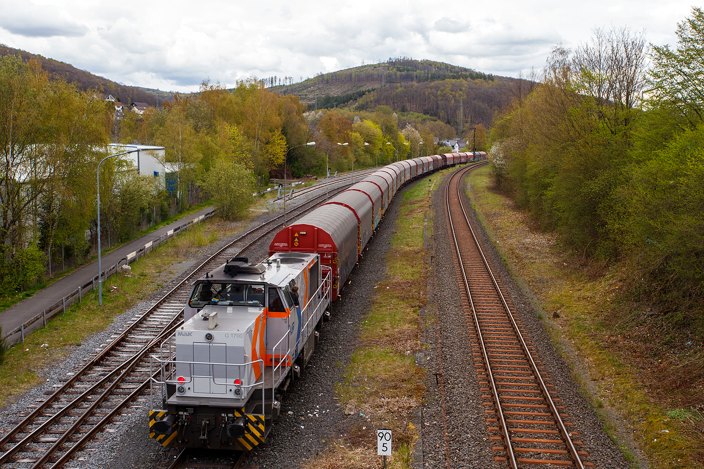 Ein langer und schwerer Coilzug im Sandwich der Kreisbahn Siegen-Wittgenstein fährt am 16 April 2026 in Neunkirchen-Struthütten auf der Freien Grunder Eisenbahn (KSW-Infrastruktur) in Richtung Neunkirchen-Salchendorf. Vorne die führende KSW 45 (98 80 0276 016-9 D-KSW) die MaK G 1204 BB. Hier am Zugschluss ist die nachschiebende KSW 42 (92 80 1277 902-3 D-KSW), eine Vossloh MaK G 1700 BB. So kann der komplette Zug aber nicht an sein Ziel hinauf zum Pfannenberg fahren, denn er muss durch die Spitzkehre Pfannenberg. So muss der Zug in mehreren Abschnitten geteilt werden und eine Lok bringt die Coilwagen hinauf. Oben befindet sich die ehemalige Grube Pfannenberger Einigkeit, wo sich heute die Produktionshallen der EMW Stahl Service GmbH ein Geschäftsbereich der SCHÄFER WERKE Gruppe befinden.