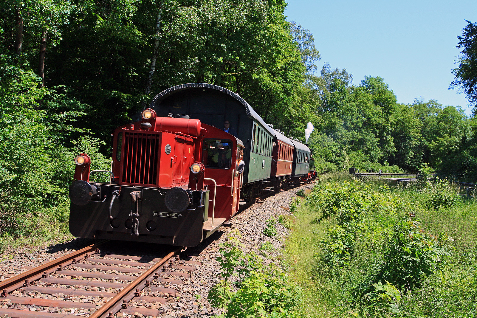 Geführt von der 323 133-9 (Köf II) der Aggertalbahn (Andreas Voll) fährt der Dampfzug „Bergischer Löwe“ vom EM Dieringhausen am 02.06.2011 in Richtung Bf Wiehl, hier kurz vor Wiehl. Am Zugende war die Dampflok "Waldbröl" des Eisenbahnmuseums Dieringhausen, die für die Rückfahrt zur führenden Lok wird.