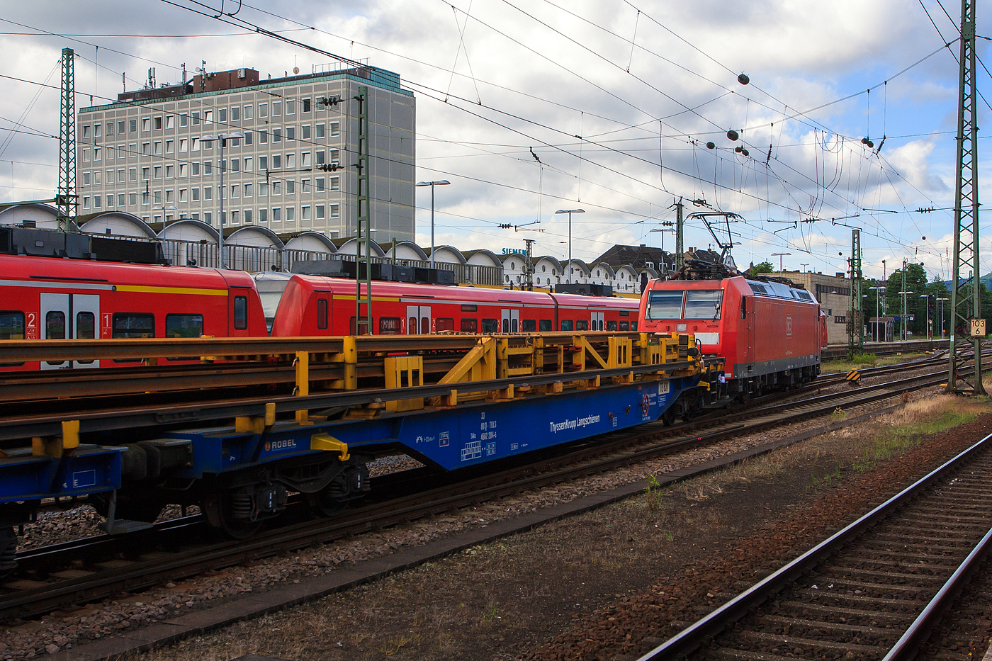 Die 185 029-6 der damaligen DB Schenker Rail (heute DB Cargo AG) fährt am 14 Juni 2013 mit einem ThyssenKrupp Langschienen Zug durch den Hauptbahnhof Koblenz in Richtung Mainz.