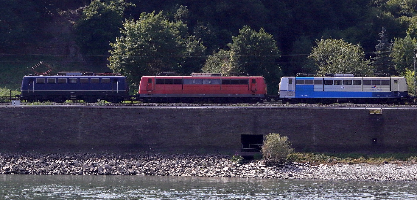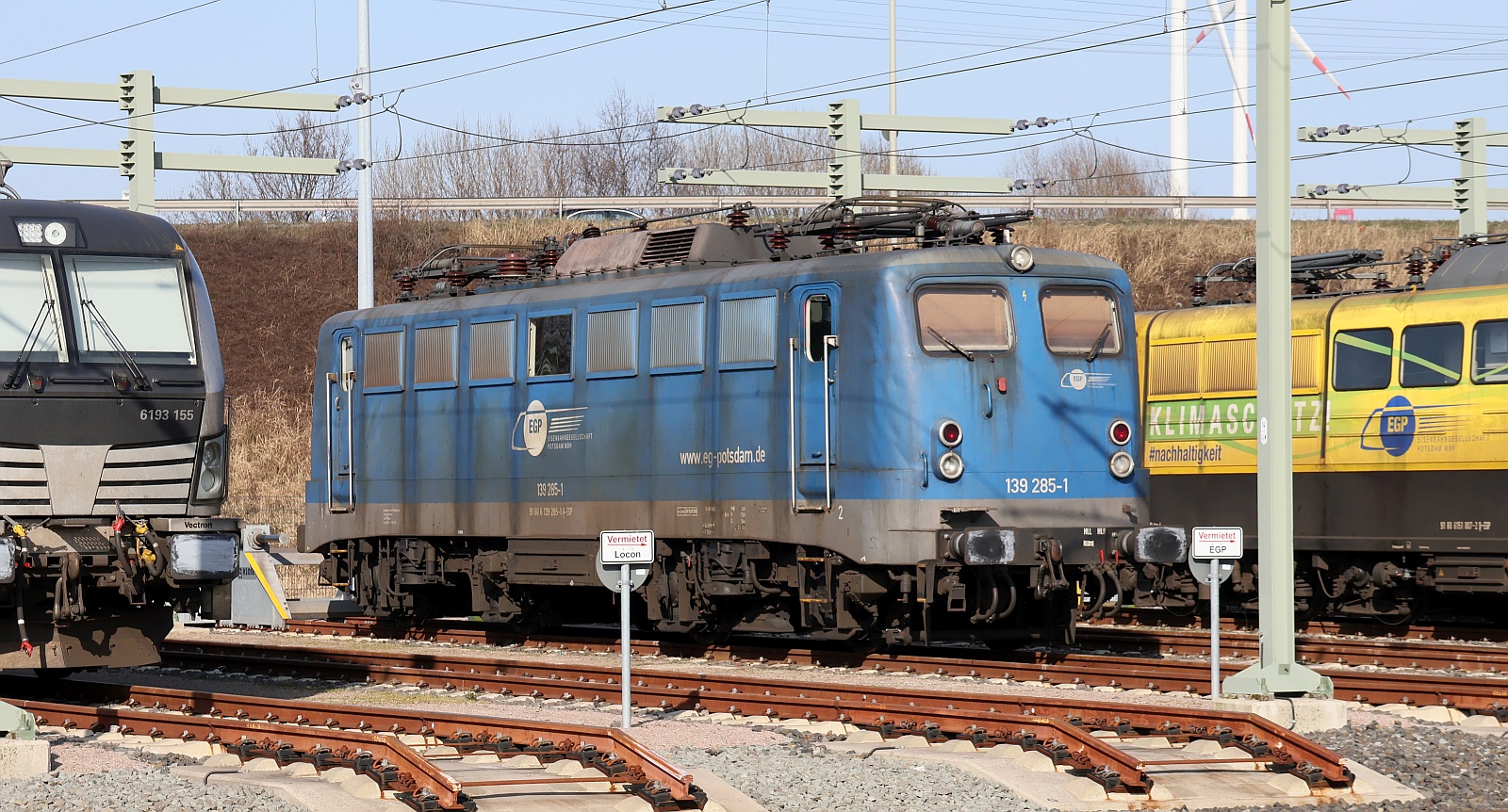 Während der DB E 10 200 geführte Sonderzug auf Ausfahrt gen Süden wartet, fährt auf dem Nebengleis ein von der DSB EA 3014 bespannter Güterzug aus Norden ein, Pattburg/Padborg 11.03.2007