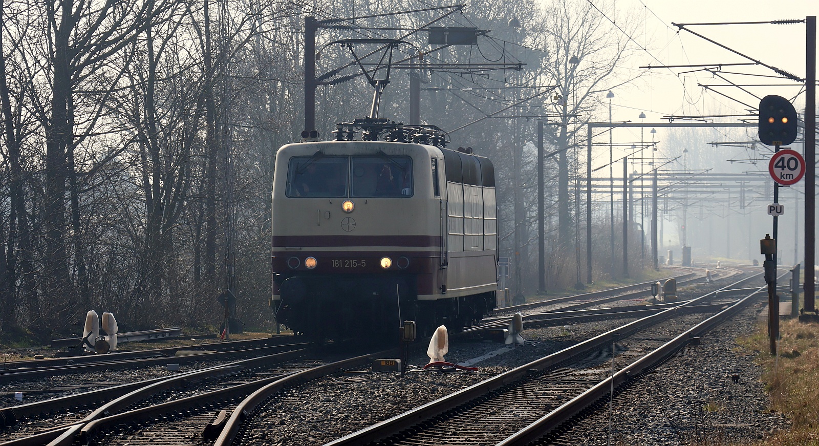 SEL 181 211-4 "Lorraine" REV/BPSM/31.03.21 und SEL/Nordliner 181 215-5 "Holstein" REV/BPSM/01.05.20 werden langsam an ihren Zug rangiert. Padborg/DK 13.03.2026