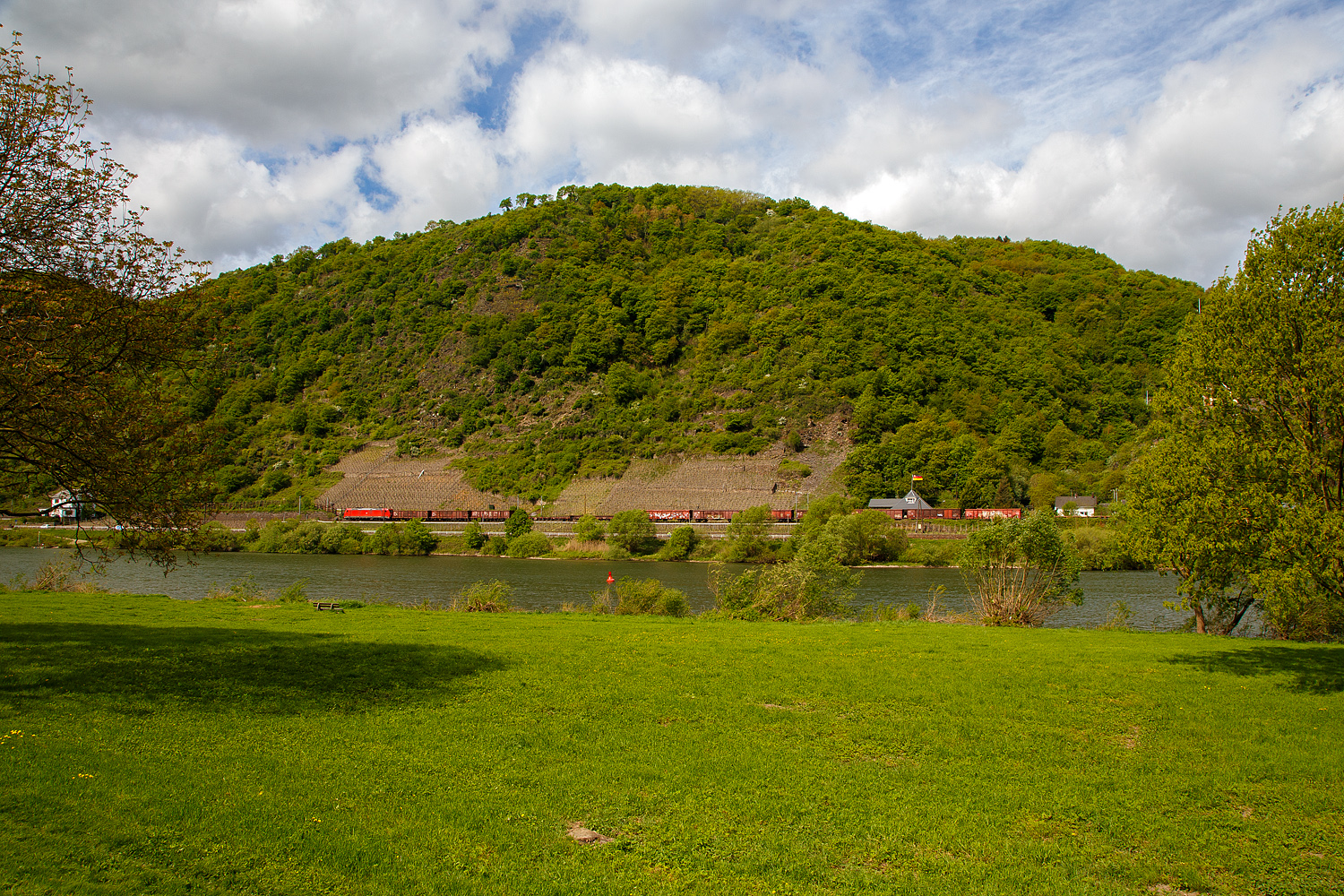 Eine Lok der Baureihe 185.2 der DB Cargo fährt am 28 April 2018 zwischen Hatzenport und Moselkern mit einem gemischten Güterzug Moselaufwärts in Richtung Trier. Armin Schwarz
