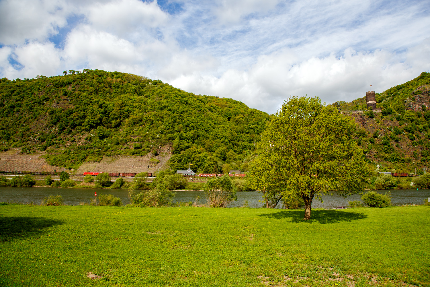 Eine Lok der Baureihe 185.2 der DB Cargo fährt am 28 April 2018 zwischen Hatzenport und Moselkern mit einem gemischten Güterzug Moselaufwärts in Richtung Trier. Rechts oben die Burg Bischofstein. Armin Schwarz