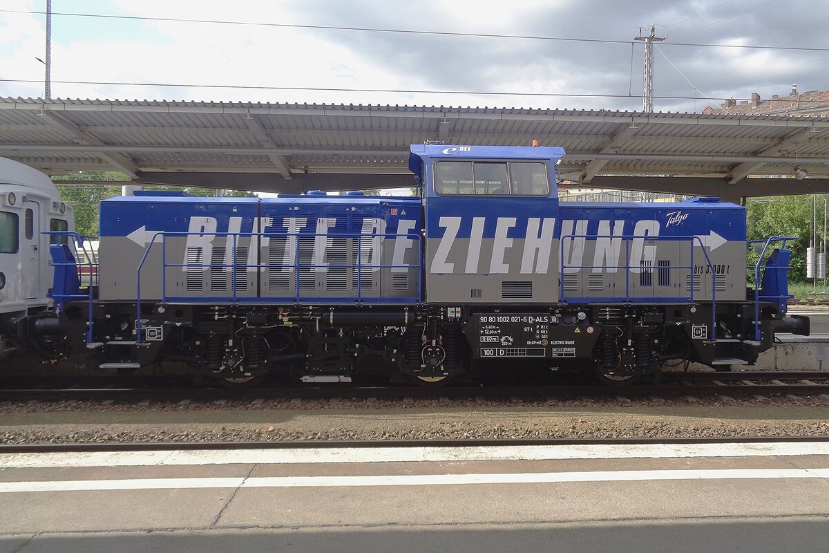 Die DB 1002 005-9 (90 80 1002 005-9 D-ALS) eine Alstom H3 Hybrid-Rangierlokomotive steht am 06.06.2019 beim Hbf Nürnberg (Aufnahme aus einem Zug heraus).