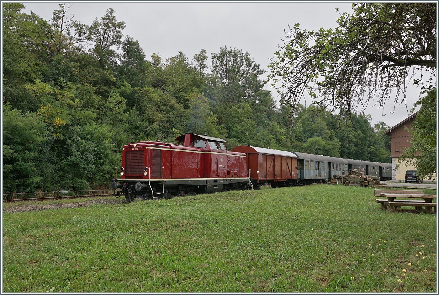 Die Arbeit wird einer Museumsbahn wohl nie ausgehen: die 236 119-4 steht mit zwei Wagen im Bahnhof von Epfenhofen.