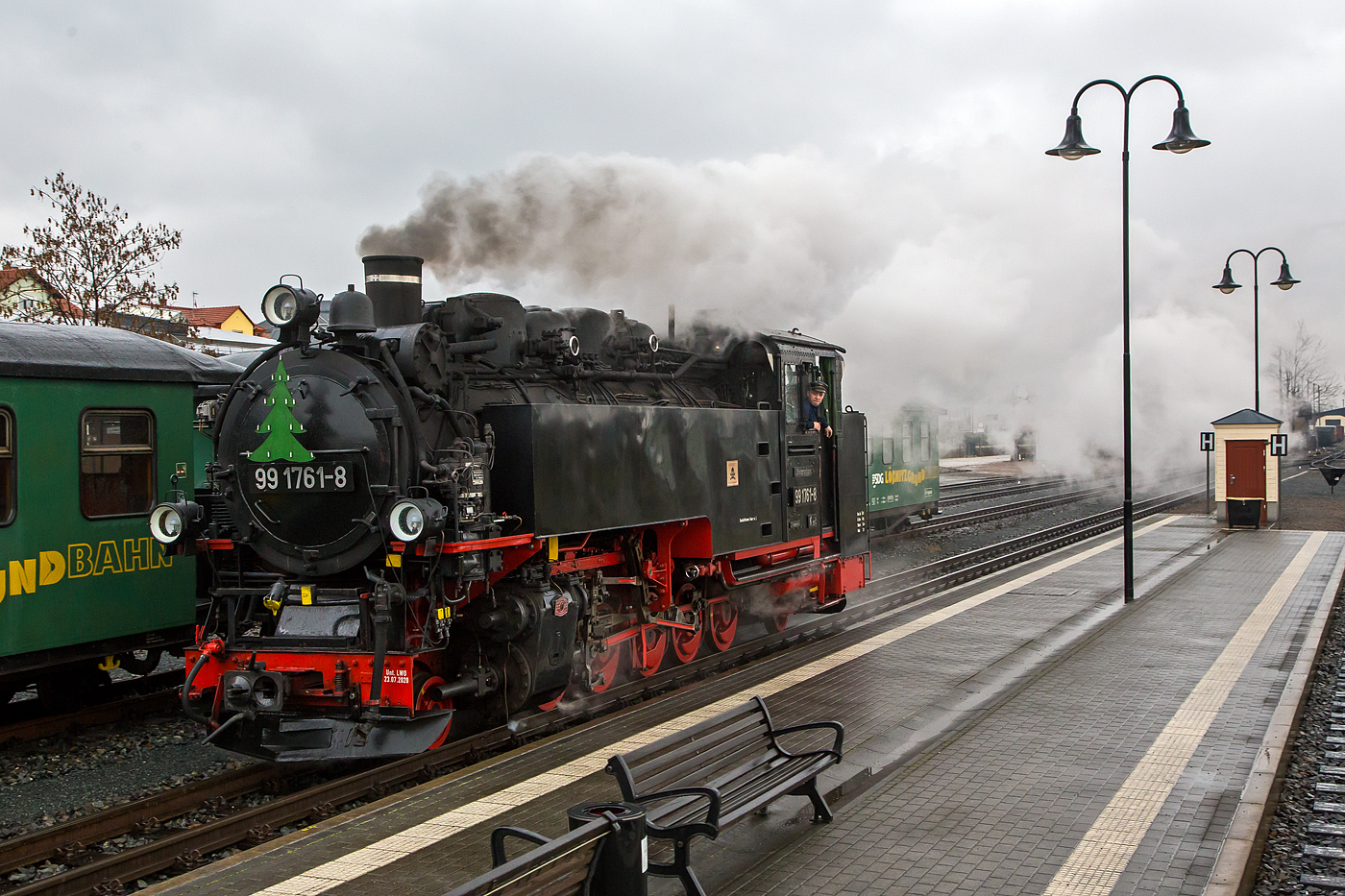 Blick auf die Strecke der sächsischen Schmalspurbahn Radebeul Ost - Moritzburg - Radeburg in der Spurweite von 750 mm (KBS 509, 12501) am 07.12.2022, hier in Radebeul bei der Pestalozzistraße / Steinbachstraße nahe der Meißner Straße. Betrieben wird die Bahn von der SDG - Sächsische Dampfeisenbahngesellschaft mbH. Für die Strecke wird heute auch die von der DB AG 1998 vergebene Marketingbezeichnung Lößnitzgrundbahn verwendet. Umgangssprachlich wird sie dagegen meist als Lößnitzdackel (kurz auch Dackel) oder früher Grundwurm bezeichnet.