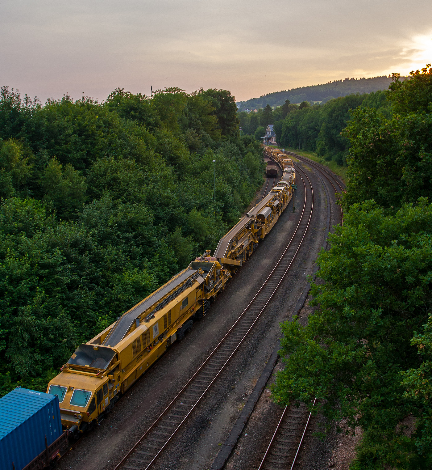 Im Einsatz auf der Hellertalbahn (KBS 462) bei Würgendorf am 15.07.2013: Die Plasser & Theurer Hochleistungs-Bettungsreinigungsmaschine RM 95-800 W, Schweres Nebenfahrzeug Nr. 99 80 9414 001-4 D-MWGB, der MGW Gleis- und Weichenbau-Gesellschaft mbH & Co. KG (Berlin).