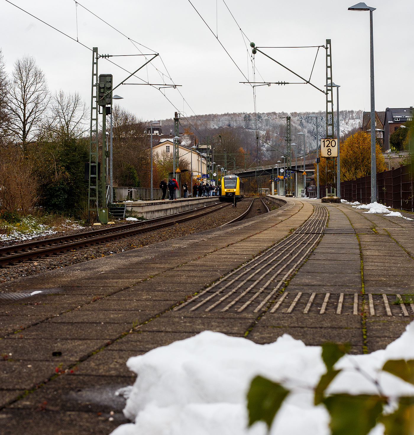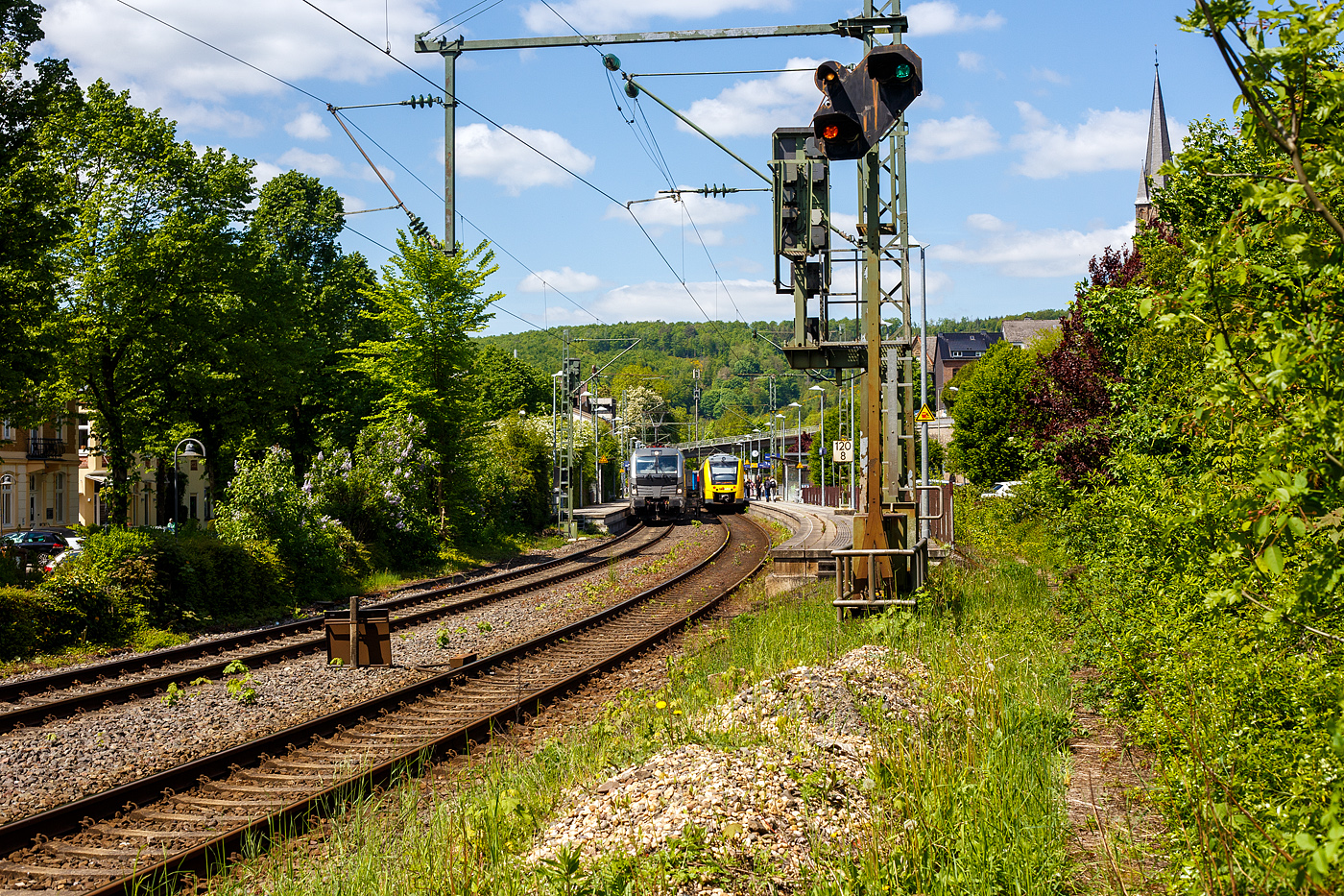 Der VT 506 (95 80 1648 106-0 D-HEB / 95 80 1648 606-9 D-HEB), ein Alstom Coradia LINT 41 der neuen Generation / neue Kopfform, der HLB (Hessische Landesbahn GmbH)erreicht am 06.04.2023, als RB 96 „Hellertalbahn“ nach Betzdorf, den Bahnhof Herdorf.