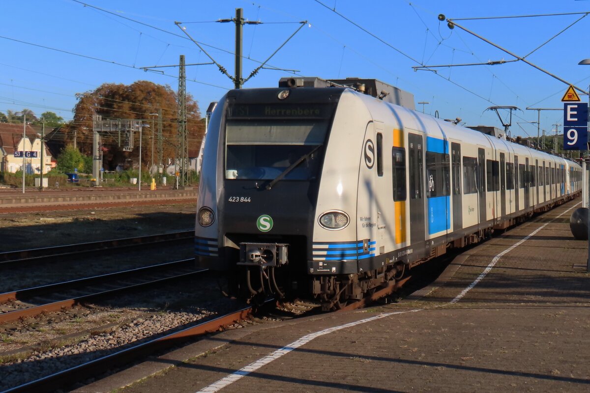 Die ET 423 332-6 / 423 832-5 gekuppelt mit 423 453-0 / 423 953-9 der DB Regio Hessen / S-Bahn Rhein-Main stehen am 27.08.2014 als S6 (Friedberg - Bad Vilbel - Frankfurt Hbf (tief) - Frankfurt Süd) im Bahnhof Friedberg (Hessen) zur Abfahrt nach Frankfurt bereit.