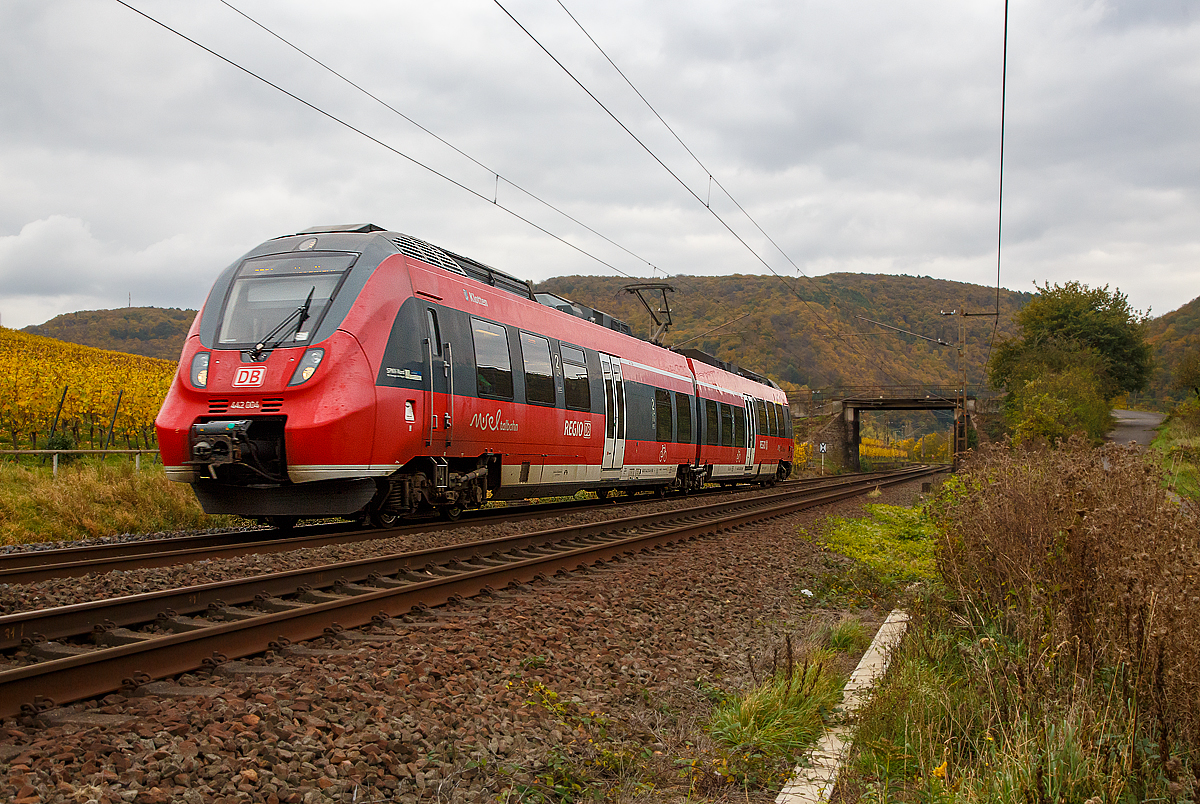 Der vierteilige Bombardier Talent 2 - 442 700 / 442 200 "Hatzenport", als RB 81 "Moseltalbahn" (Trier – Cochem – Koblenz), fährt am 30.04.2018 durch Müden (Mosel) in Richtung Koblenz.
