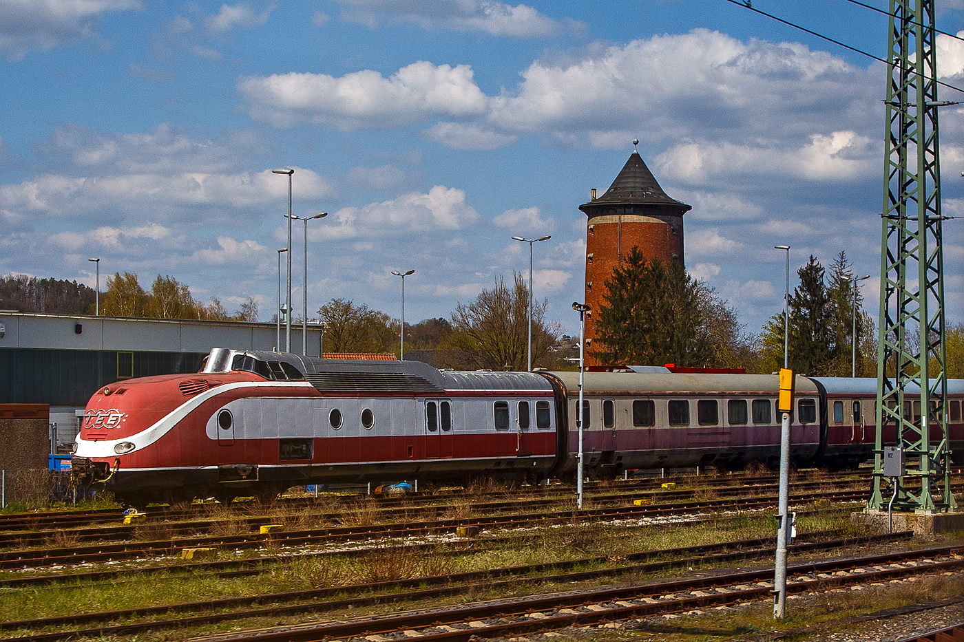 Der sechsteilige ehemalige TEE (Trans-Europ-Express-Verkehr) VT 11.5 / VM 11.5 der Deutschen Bundesbahn, ab 1968 DB BR 601 / 901 steht am 21.04.2023 beim DB BW Lichtenfels, aus einem fahrenden Zug heraus (durch die Scheibe) fotografiert. Leider ist der Zug in einem mäßigen Zustand, und könnte viel neue Farbe vertragen.