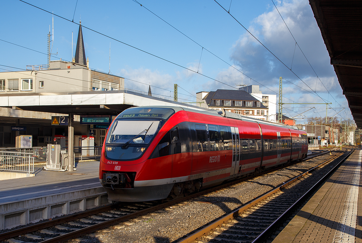 Der Dieseltriebzug 928 255 / 628 255 „Bad Laasphe“ (95 80 0928 226-8 D-DB / 95 80 0628 226-1 D-DB) der Kurhessenbahn (DB Regio) am 02.01.2019 auf Überführungsfahrt durch den Bahnhof Limburg (Lahn), zum AW Limburg, wo er wohl für den Verkauf vorbereitet wird.